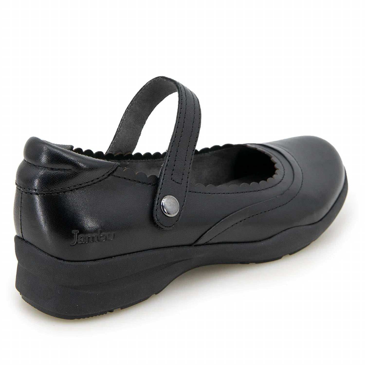 Perfect blend of style and comfort designed for the modern woman. Made from premium leather material. Enhanced by a charming scalloped edge and a round toe shape. Flexible rubber outsole and removable contoured insoles ensure all-day comfort. Hook and loop closure concealed under a decorative button-like stud provides adjustable sizing ease. APMA accepted for optimal foot support.