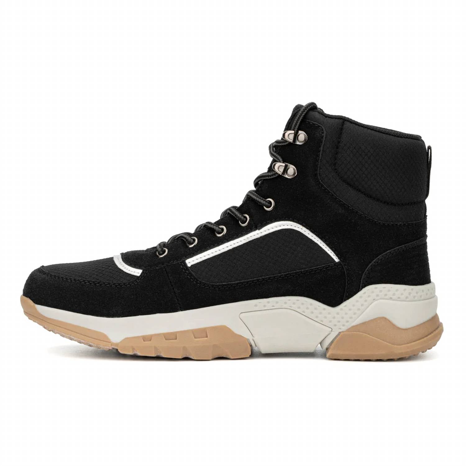 Step into style with the Men's Eliel Casual Boots by Reserved Footwear New York, designed for city living with a sporty edge. These black boots feature a lace-up design and a round toe, complemented by a cushioned collar for enhanced comfort. Crafted with an upper of 55% Faux Suede and 45% Mesh, and a durable Thermoplastic Rubber outsole, they offer a perfect blend of breathability and support. With a heel height of 2 inches, a shaft height of 5.5 inches, and a shaft circumference of 13 inches, they are ideal for winter wear.