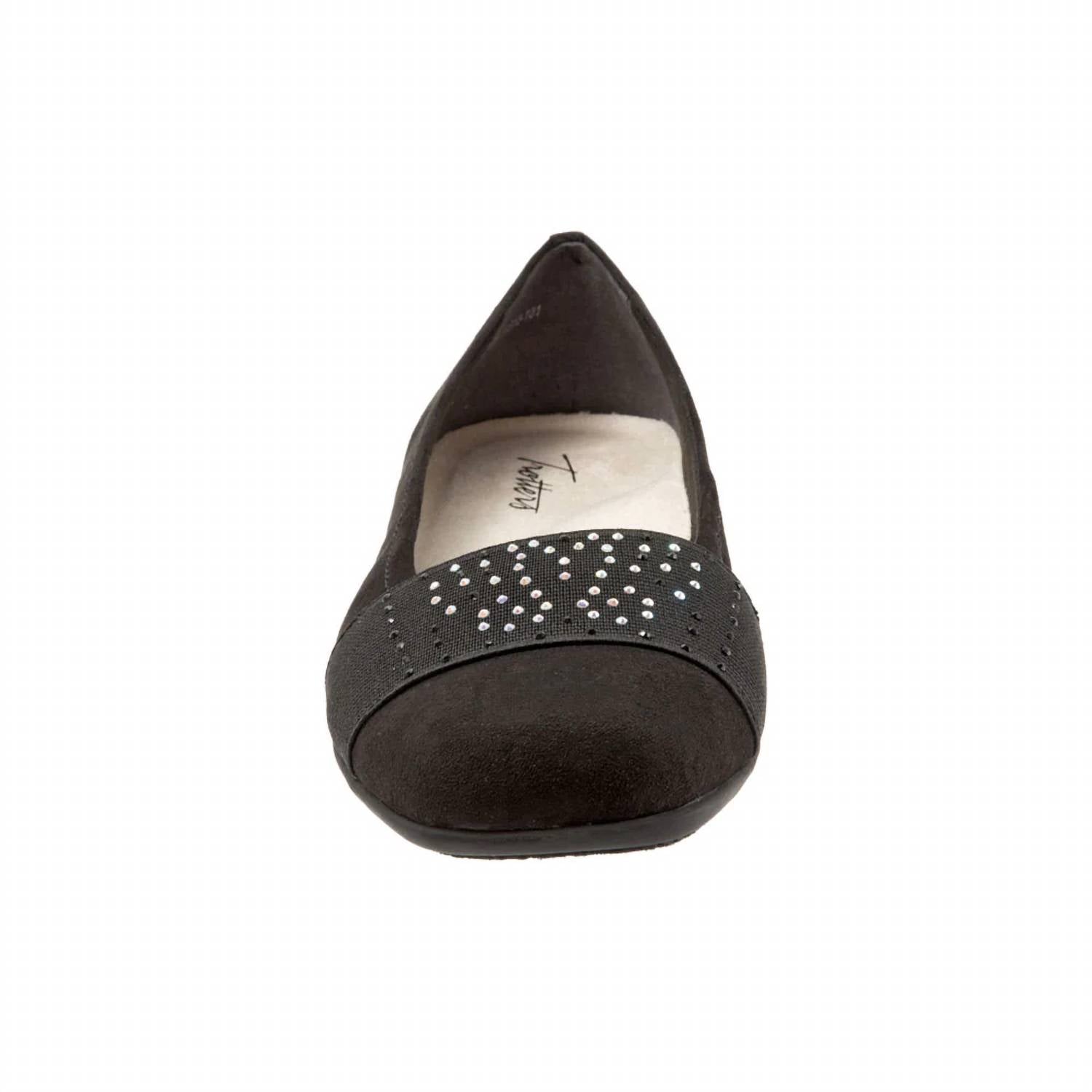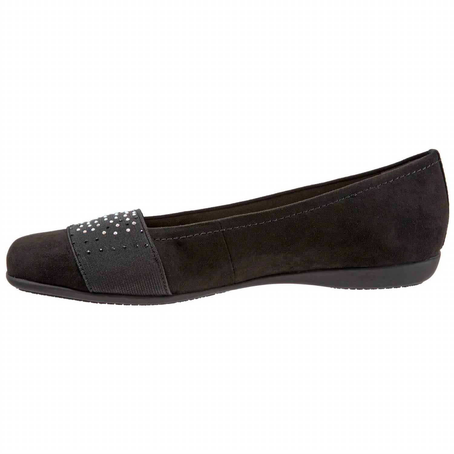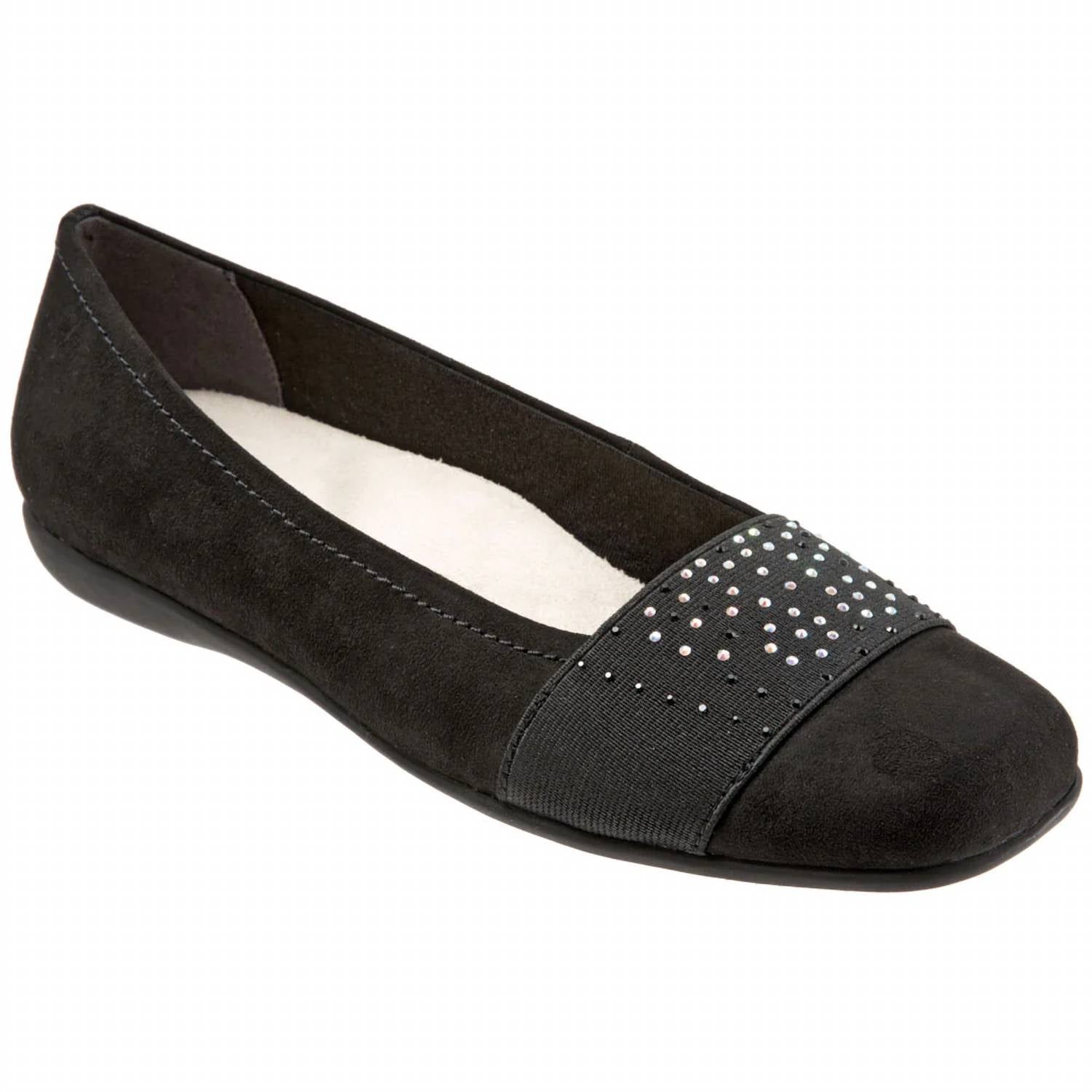 Embrace comfort and style with the Women's Samantha Micro Flats by Trotters, an elegant addition in Black Silver Gem. These flats feature an antimicrobial microfiber upper lining and a cushioned insole for extra comfort. The squared toe design pairs perfectly with a flat heel, measuring at just 5/8" for easy wear all day. Crafted with a molded rubber unit sole and a removable cushioned footbed with arch support, these shoes ensure both function and fashion.
