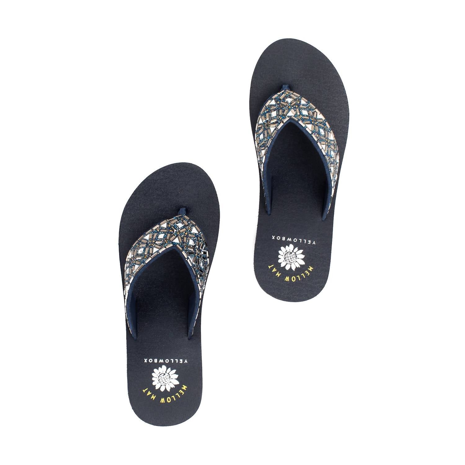 Step into summer with the Women's Whittier Wedge Flip Flop Sandal by YELLOWBOX, a stylish choice in navy that embodies quiet luxury. Crafted with a genuine leather upper, this sandal features a comfortable Mellow Mat™ EVA footbed and a durable rubber outsole. Enjoy a mid-heel height of 2.5 inches and a convenient 1-inch platform for added support. Perfect for vacation occasions, the open toe and wedge heel design make it an effortless addition to any summer wardrobe.