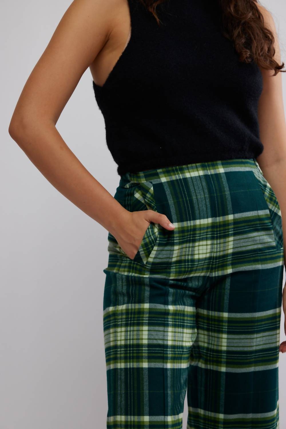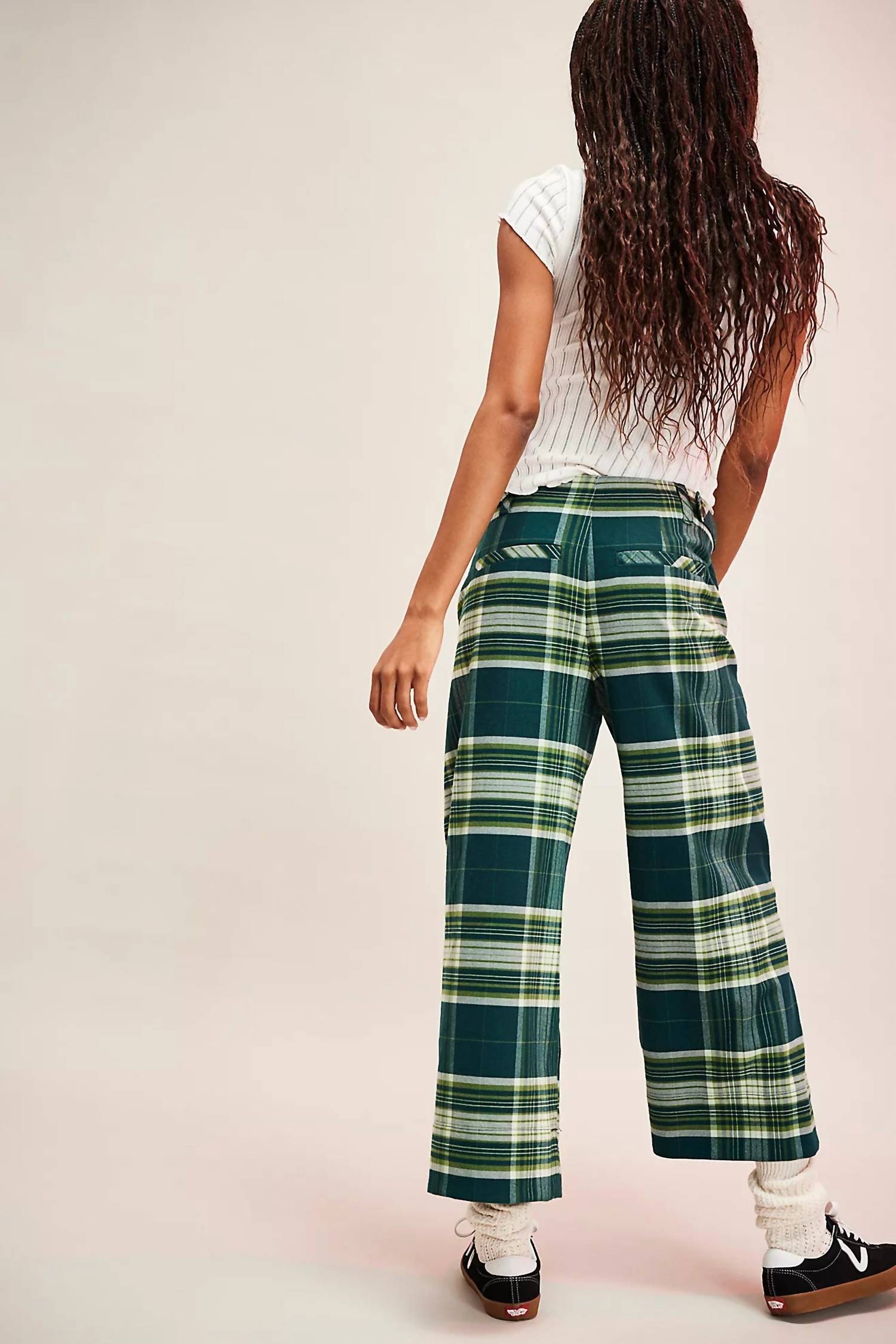 Introducing the Acadia Trouser by Free People, a standout piece in a vibrant Green Combo plaid that's perfect for making a statement. Designed with a mid-rise and relaxed wide-leg fit, these trousers feature a cropped inseam measuring 25 inches. Made from a soft viscose blend, they boast a chic side zipper closure and practical four-pocket design. Ideal for a grunge-inspired fall look, they're best cared for by hand washing.