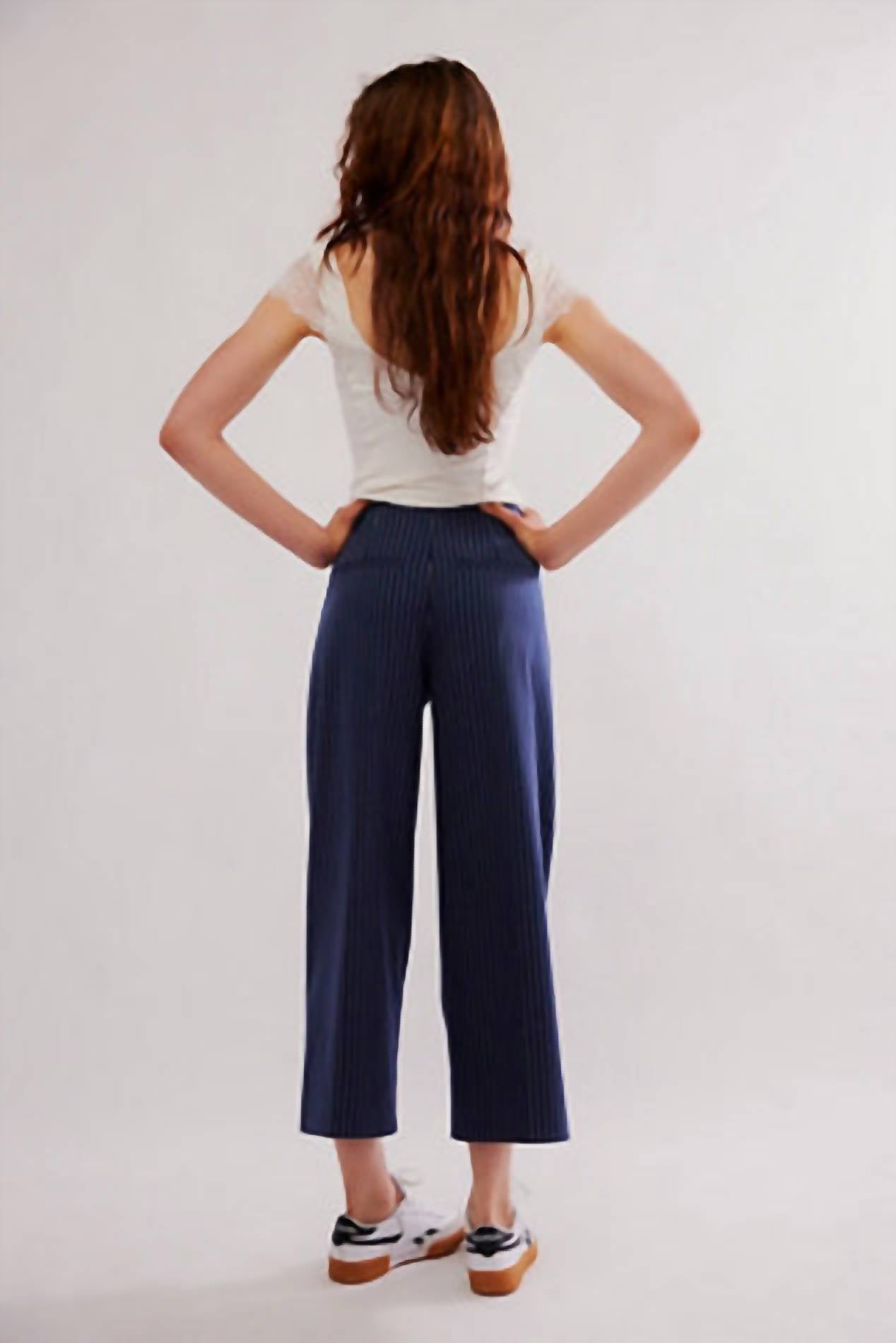 Enhance your wardrobe with this trendy cropped number, designed to blend style and practicality. The comfortable fit allows for easy all-day wear. The perfect length to pair with your favorite mules. Discover the Acadia Trousers Pants by Free People, offering a blend of timeless style and modern chic. These trousers feature a high-rise fit with a subtly tapered silhouette, characterized by a classic pinstripe pattern and cropped inseam. Equipped with an invisible side zip closure and welt pockets, they make a versatile addition to any wardrobe. Perfect for pairing with loafers or kitten heels, these blue trousers ensure effortless elegance for any occasion. Care: Hand wash and lay flat to dry.