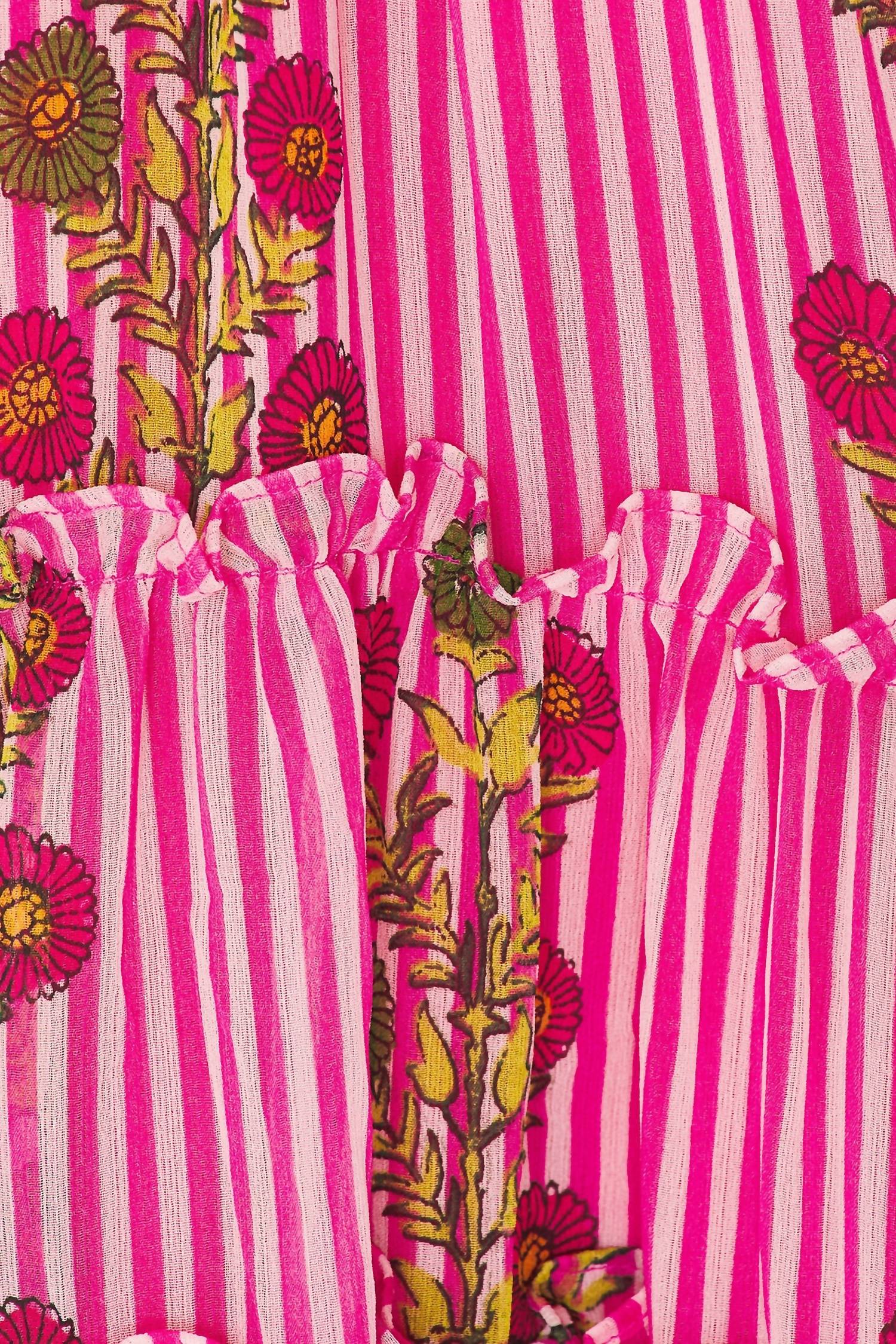 Introducing the Alejandra Midi Dress by Free People, an enchanting piece exuding vintage-inspired charm in a vibrant hot pink combo. This midi dress features spaghetti straps, with 100% polyester composition, designed in a high-low, tiered skirt silhouette. Adorned with a floral pattern, it is effortlessly put on with a pull-on closure. Easy care with machine wash, the shirred bodice and dropped-waist seam make it a versatile choice for a boho chic vacation vibe.