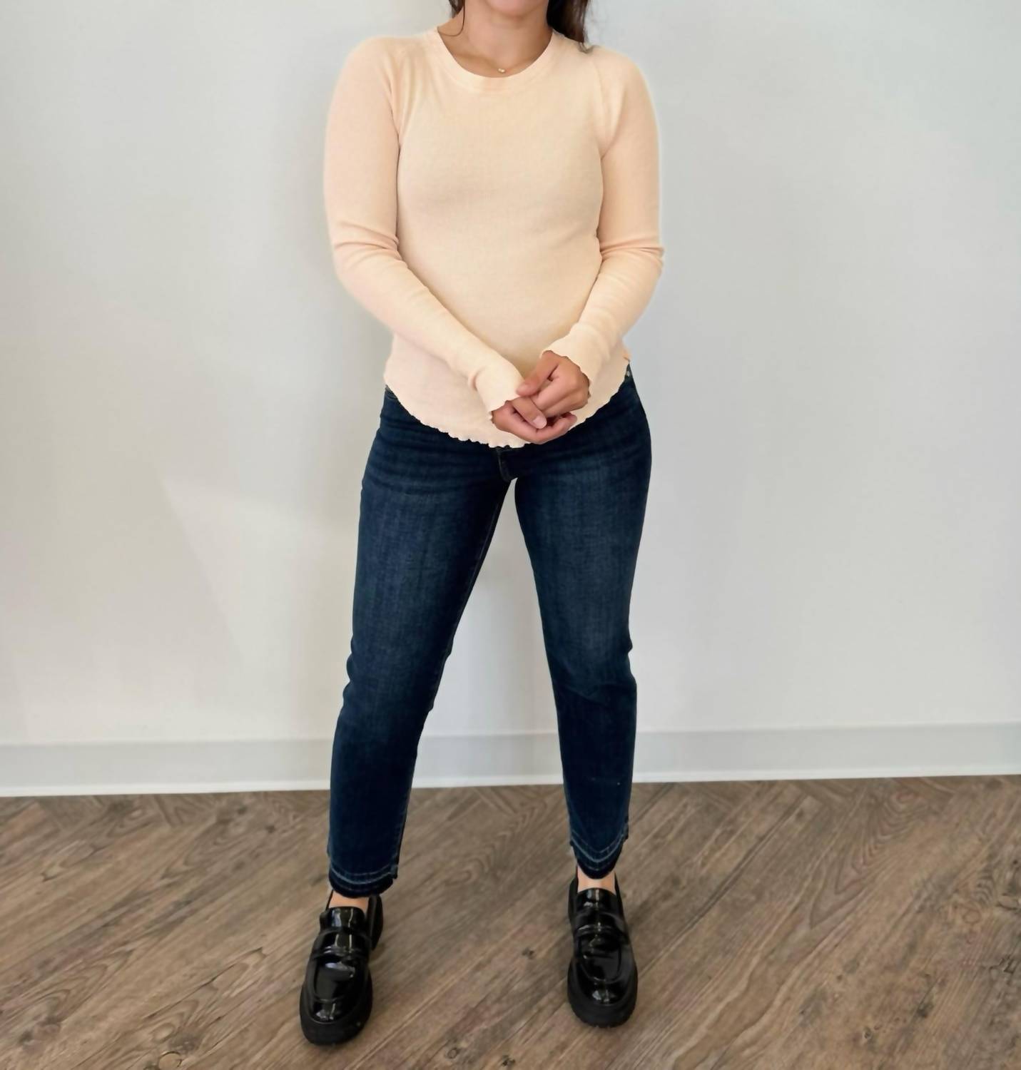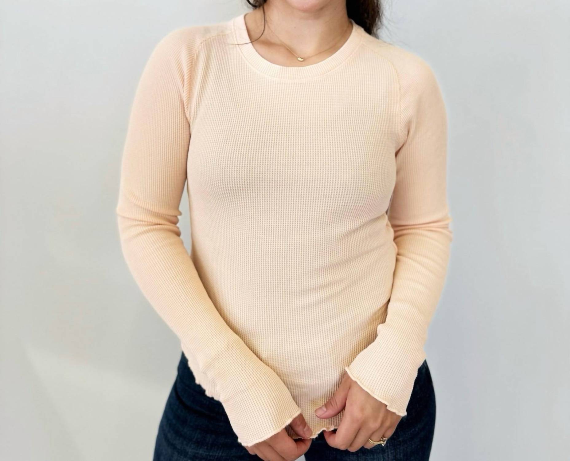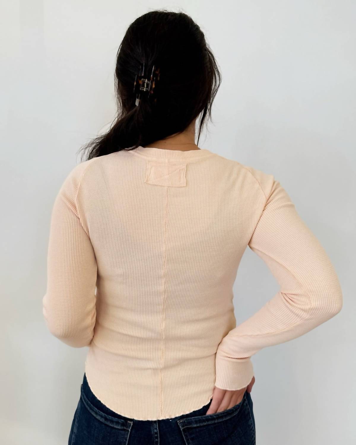 A long sleeve top you can wear with denim, skirts, well... just about anything! Introducing the Amelia Long Sleeve Tee by Free People, a luxurious choice in textured waffle knit fabric. This pale peach tee features a classic crewneck and a pull-on design, making it both elegant and easy to wear. Perfect for any sophisticated occasion, it brings comfort and style to your spring workwear wardrobe. Add this timeless staple to your collection today.
