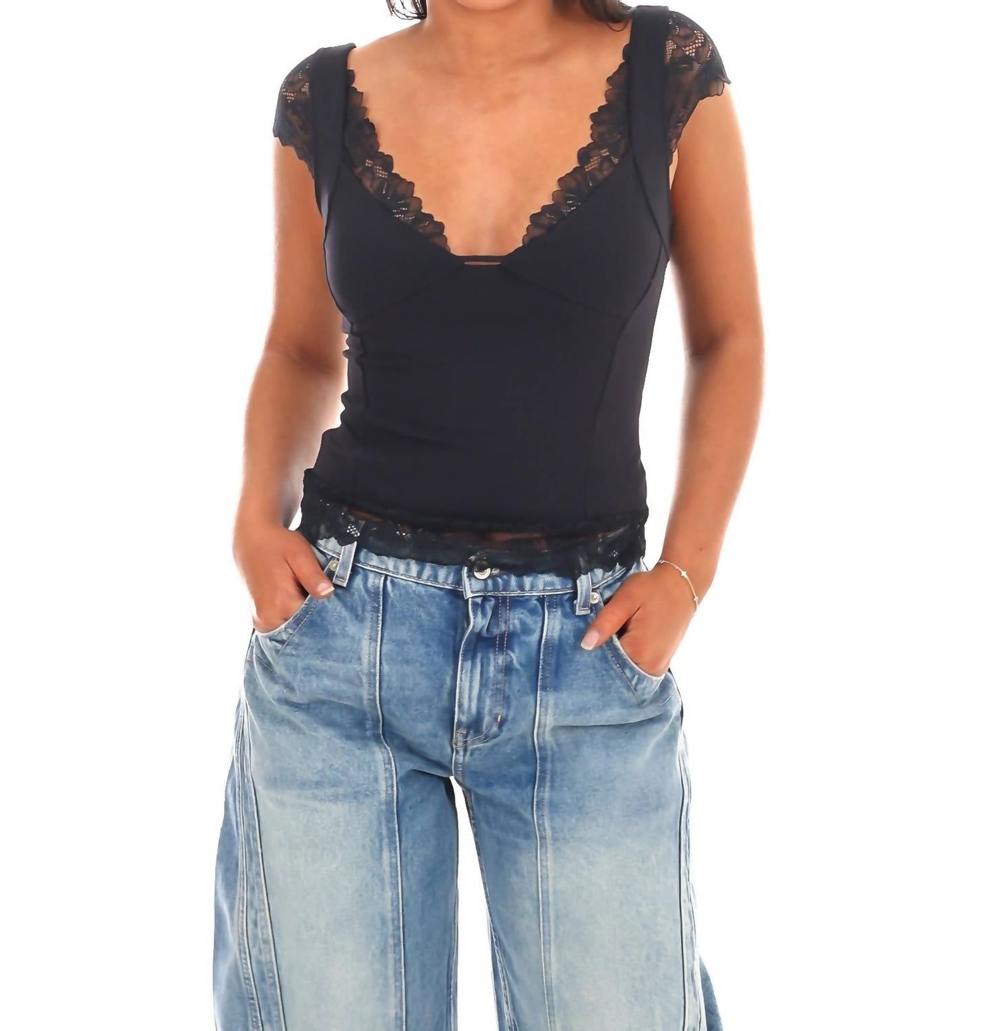 Discover the Better Not Cami Top by Free People, an epitome of style and comfort in chic black. This hip-length cami is crafted from a soft nylon blend with short cap-sleeves and a delicate lace trim, featuring a classic low scoop neckline and low back. Composition: Shell: 88% Nylon, 12% Spandex; Lace: 90% Nylon, 10% Spandex. Closure: Pull on. Care: Machine wash cold. Ideal for adding a touch of elegance, it's perfect for pairing with your favorite denim or as a lace-adorned base layer for any dinner party or New Year's Eve celebration.