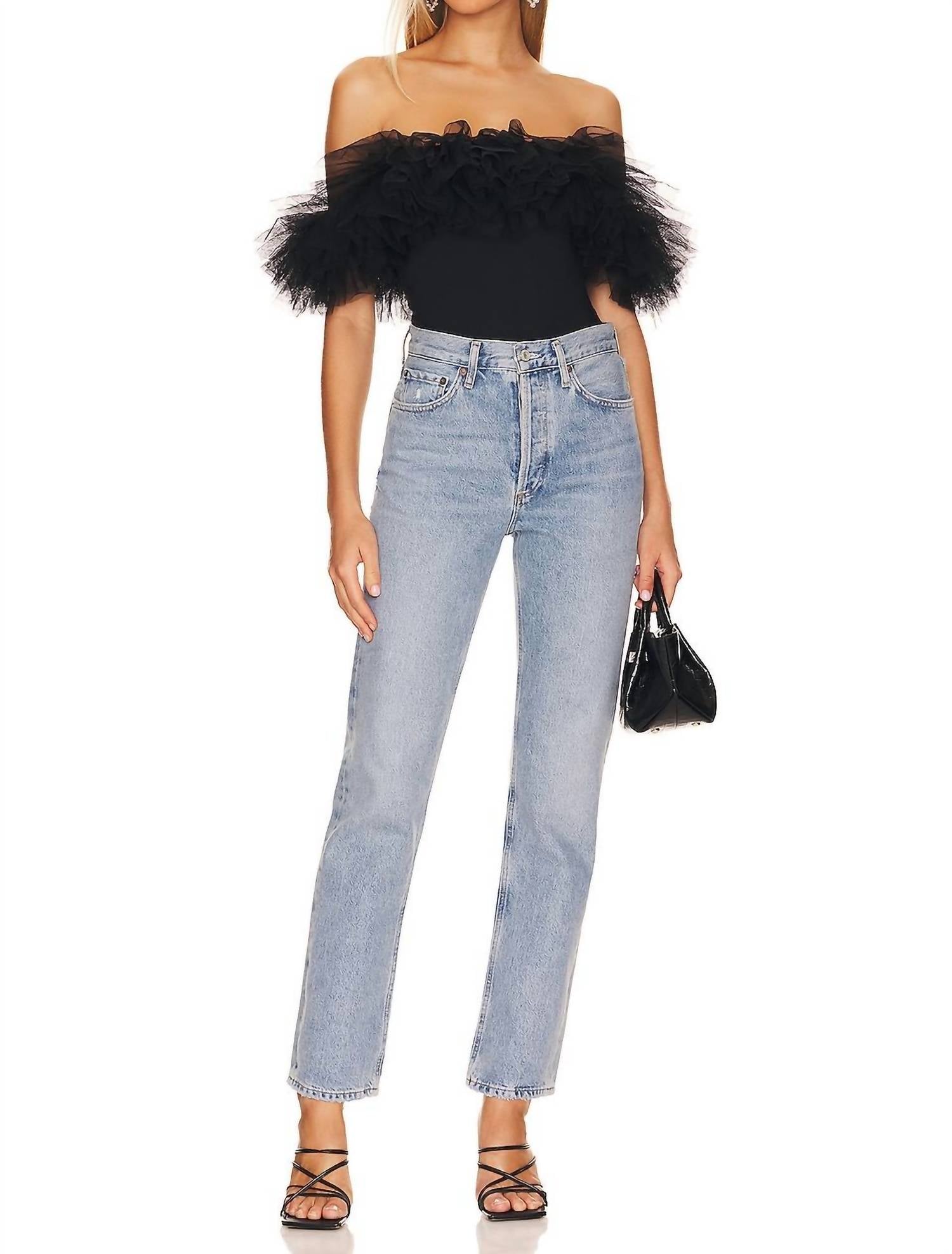 Pair this number with your favorite high-waisted jeans. Elevate your cocktail party ensemble with the Big Love Bodysuit by Free People, a chic addition to your summer wardrobe. Featuring short sleeves and an off-the-shoulder tulle ruffle neckline, this black solid bodysuit perfectly embodies the quiet luxury trend. Crafted from a polyester blend with a jersey bodice, it offers a comfortable fit with a snap closure and thong back. Care instructions recommend hand washing for longevity. Imported.