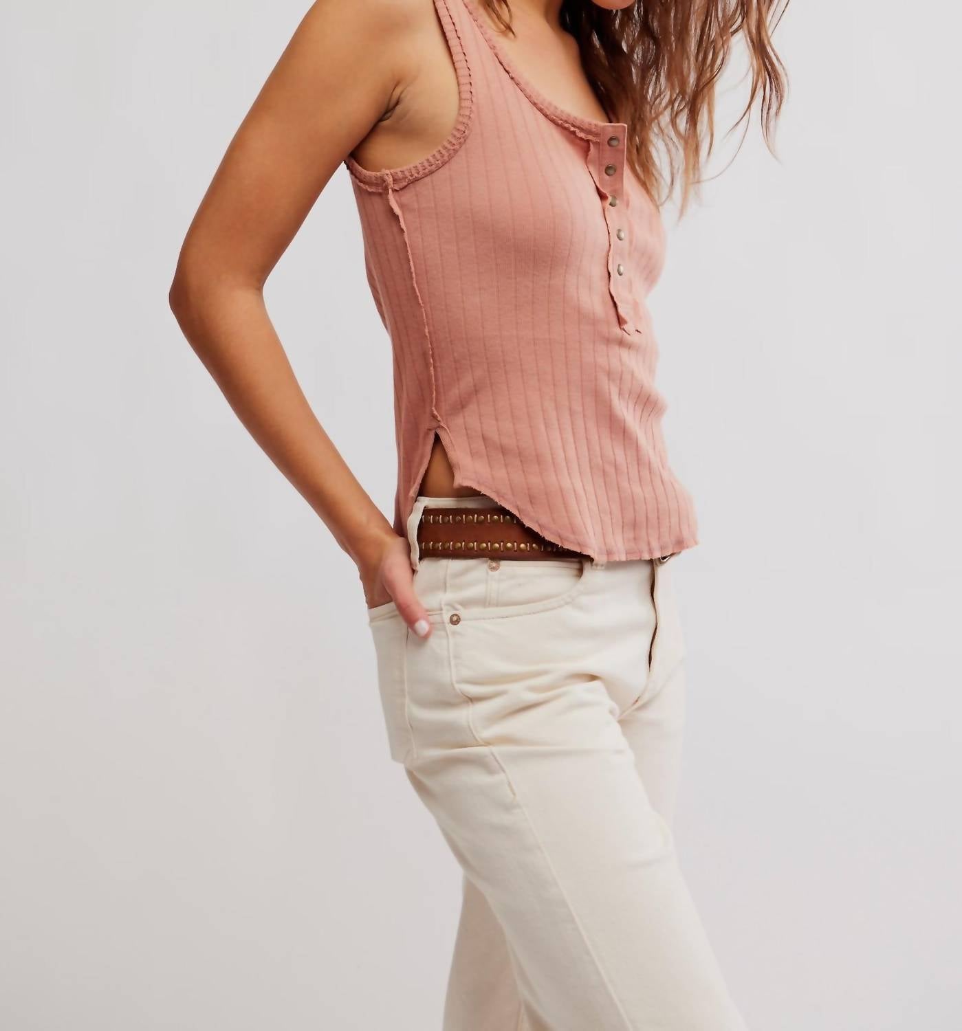 Fit, fabric and functionality. This tank top checks all the boxes. Get ready for summer with the Care FP Bryson Henley Tank by Free People in a warm Tawny Birch shade. This sleeveless tank is crafted from a conscious blend of 25% organic cotton, 25% recycled cotton, and 50% cotton, offering a relaxed, full-length fit perfect for your Fourth of July vacation outfits. The henley snap detail and scoop neckline add a touch of flair, while the wide ribbed texture and exposed seams contribute to its streetwear appeal. Closure: Pull on. Care: Machine wash cold. Measurements for size small include a 31-inch bust and a 23.5-inch length.