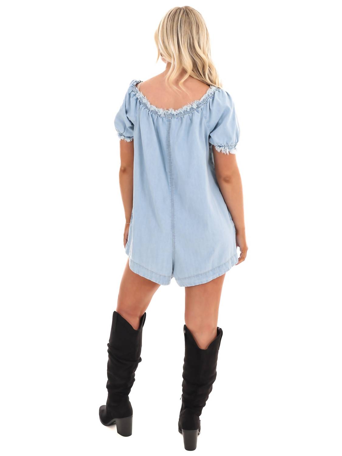 It doesn't take much for this one piece to look effortlessly cool. Add some statement jewelry to dress it up, or throw on some sneakers for a more casual vibe. Embrace the easygoing charm of the Daisy Denim Babydoll Romper by Free People, crafted in a delightful August Blue hue. This romper features a relaxed, babydoll-inspired fit with a wide neckline that can be worn off-the-shoulder, and it includes a front keyhole and frayed detailing for added flair. Closure is a convenient pull-on style, while the wide-legged silhouette ensures an airy feel throughout the spring season. Ideal for both engagement occasions and capturing the Western trend, this romper pairs perfectly with tall boots or sneakers for versatile styling.