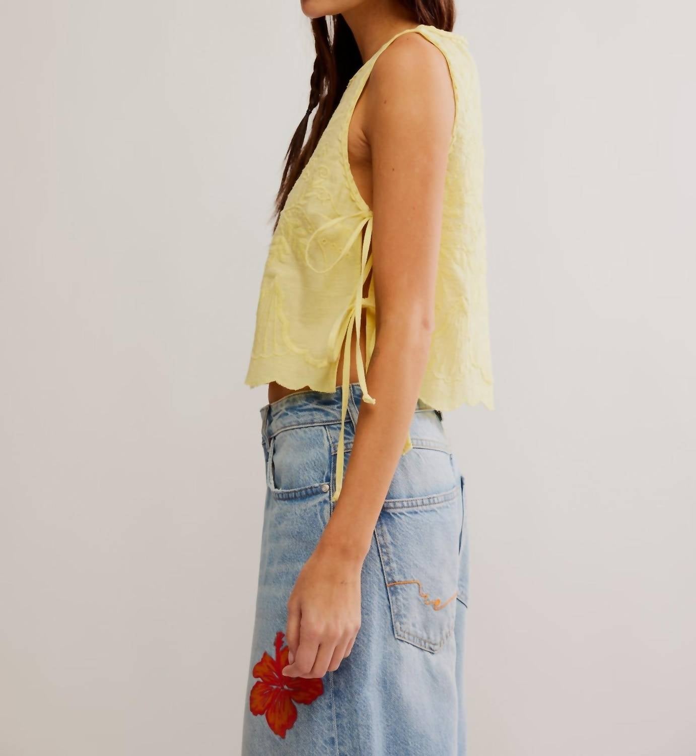 This classic tank top is perfect for layering and cute enough to wear on its own. The Faded Gardens Tank Top by Free People is a chic choice for your spring vacation wardrobe. This sleeveless, slightly cropped tank features a soft cotton composition with delicate floral embroidery and a graceful scoop neckline. Designed with adjustable side ties and a charming scalloped trim, the piece has a keyhole cutout at the back for added flair. Closure is easy with a convenient pull-on style and the garment measures 33 inches at the bust and 19 inches in length for size small.