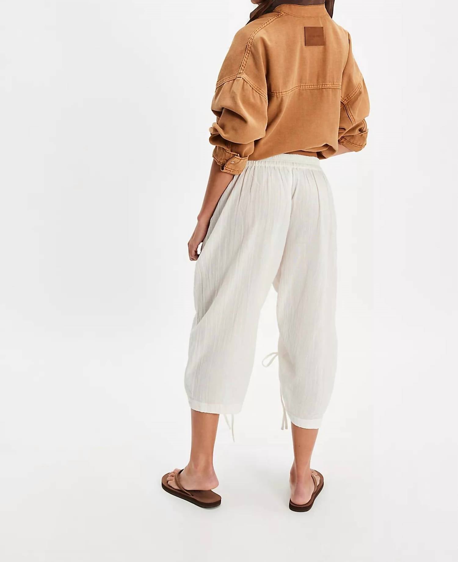 Style No. 88770235; Color Code: 010 A lightweight, wear-everywhere pair, these gaucho-style pants are perfect from this season to the next. Fit: Low-slung, loose cropped fit Features: Elastic waistband for pull-on ease, dropped side pockets, cinched tie detail, breezy cotton fabrication Why We ❤ It: Beachy with sandals or off-duty with sporty sneakers, this pair has endless ways to wear. Size + Fit Measurements for size Small Inseam: 19.75 in Hips: 44 in Waist: 29 in Rise: 12.75 in Contents Care Machine Wash Cold Contents 100% Cotton