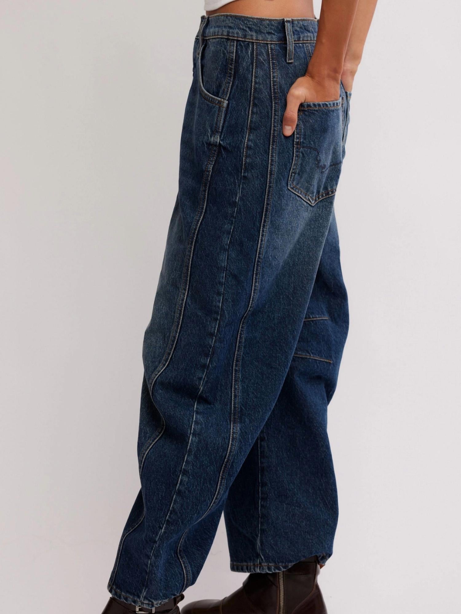 These must-have jeans are fit to perfection. Introducing the Paulette Mid Rise Barrel Jeans by Free People, a statement piece for your streetwear collection in dark wash. These mid-rise jeans boast a relaxed fit with a wide-leg silhouette that tapers at the ankle, crafted from a cotton blend of 57% Cotton and 43% Lyocell. Featuring a functional design with a button closure, 4 pockets, and belt loops. Care instructions recommend machine washing and tumble drying for easy maintenance, making these jeans a perfect addition for the back-to-school season.