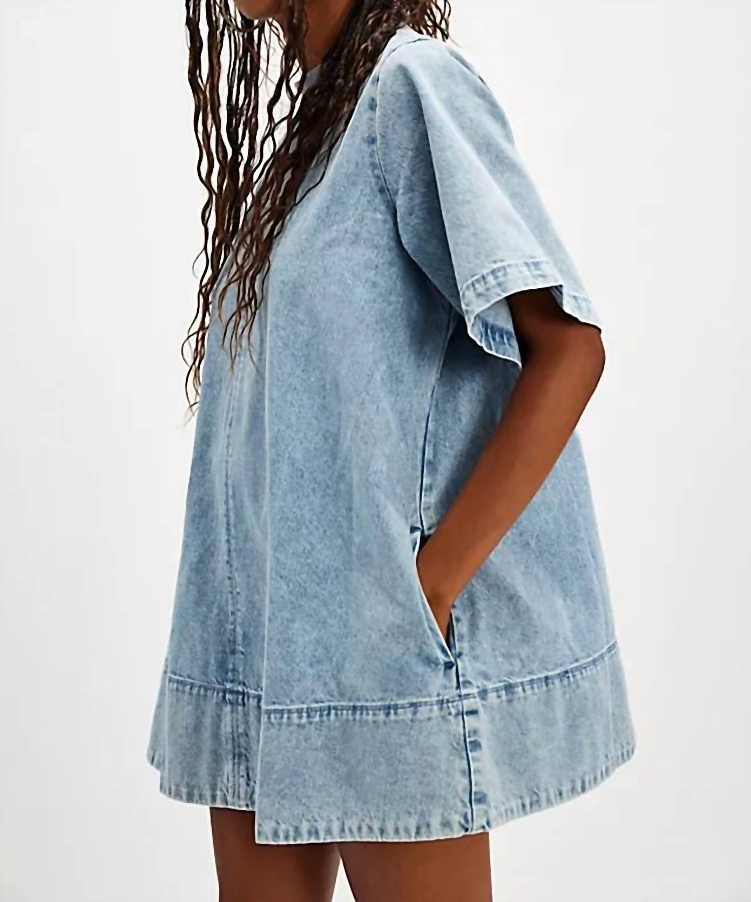 The kind of easy and flattering dress you'll be reaching for all season long. The Harlow Mini Dress by Free People in Ocean Blue is a chic option for your casual collection, boasting short sleeves and a soft denim fabrication. Crafted from 100% Cotton, this shift-style mini dress features a 33.5-inch length and is complete with a ribbed crew-neckline and defined seaming. Made for convenience and style, it includes a handy zip closure at the back of the neck. Designed for easy care, simply machine wash it when necessary.