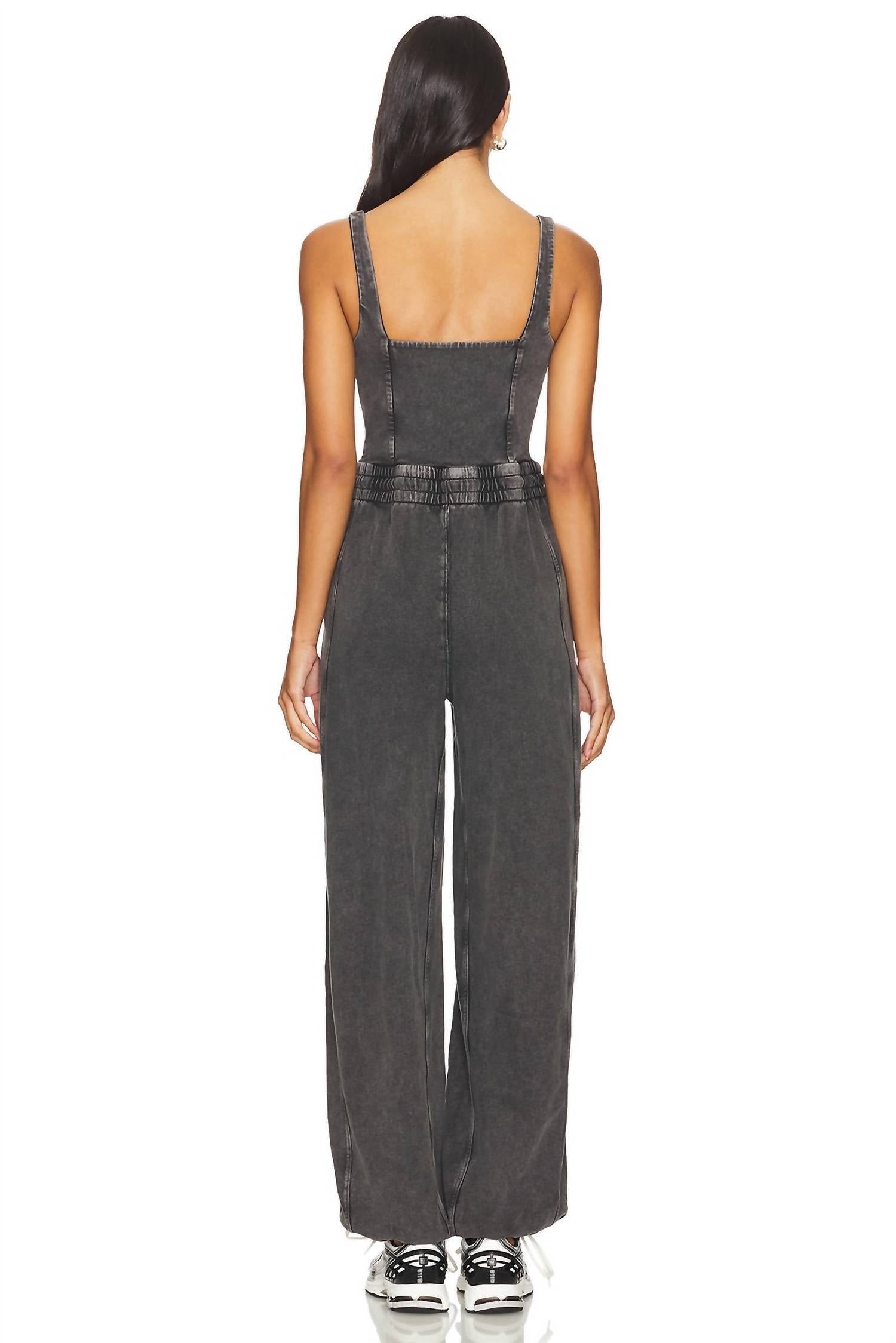 Elevate your wardrobe with the Inbound Pull On Onesie by Free People, a chic and comfy addition in classic black. Featuring a pull-on style with a fitted top and relaxed, tapered legs, this onesie has a square neckline, detailed bust seaming, and large side pockets. Crafted from a soft cotton blend, it includes ruching around the knee, elastic ankle cuffs, and an adjustable drawstring waistband for customized comfort. Perfect for spring streetwear or concert outings, this solid-patterned piece offers both style and practicality.
