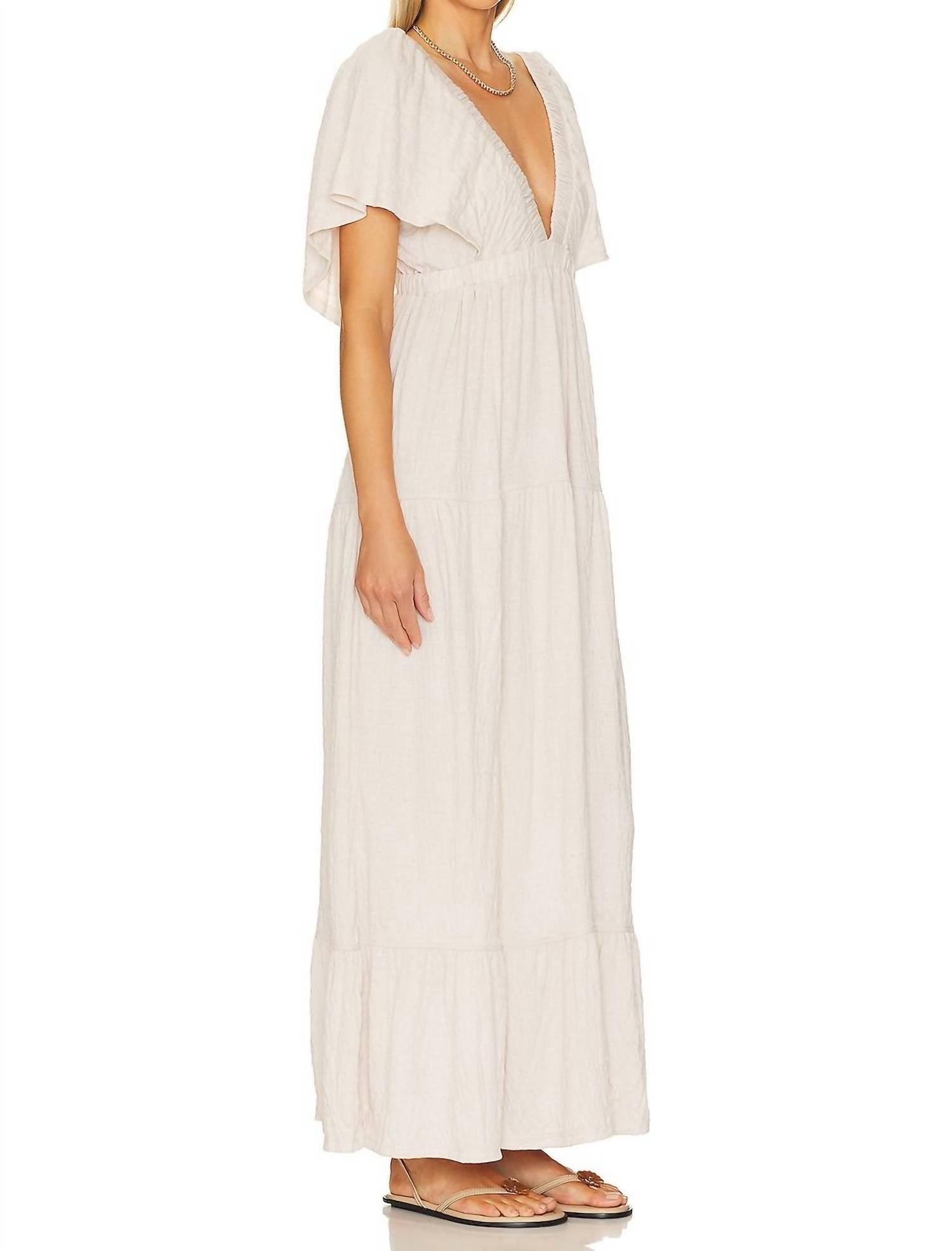 Introducing the La La Maxi Dress by Free People in a serene Salt hue, crafted for effortless elegance. This maxi dress boasts flutter sleeves and a V-neckline, accentuating its tiered silhouette. Composition: 65% Polyester, 34% Viscose, 1% Elastane. Length: 56.5 inches, with a convenient pull-on style and an elastic empire waist. Care instructions include machine wash cold.