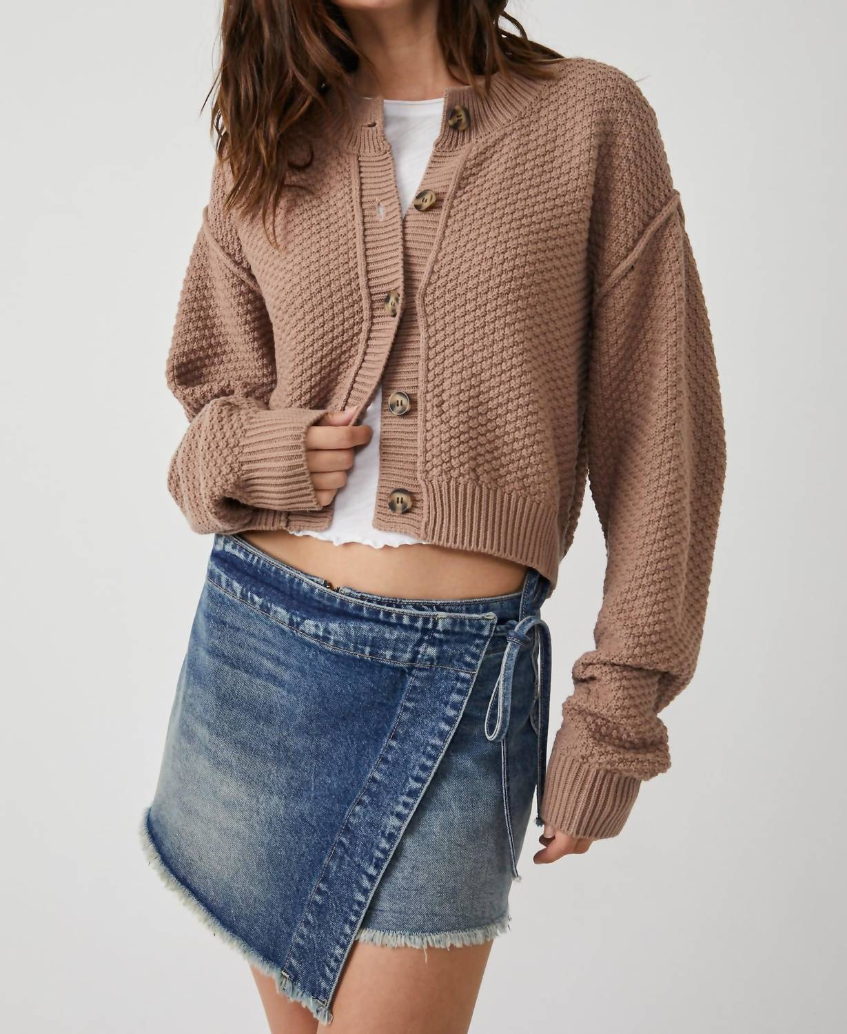 A classic fit that works just as good buttoned as it does left open. Introducing the Lila Button Front Long Sleeve Cardigan by Free People, the perfect addition to your fall wardrobe for a cozy, preppy look. This softly textured cardigan comes in a stylish Bunny hue and features a slightly open weave and cinched cuffs. Made from 61% Cotton, 39% Acrylic, it showcases a cropped silhouette with a slim fit and wooden button closure. Care is simple with machine wash instructions and a recommendation to lay flat to dry.