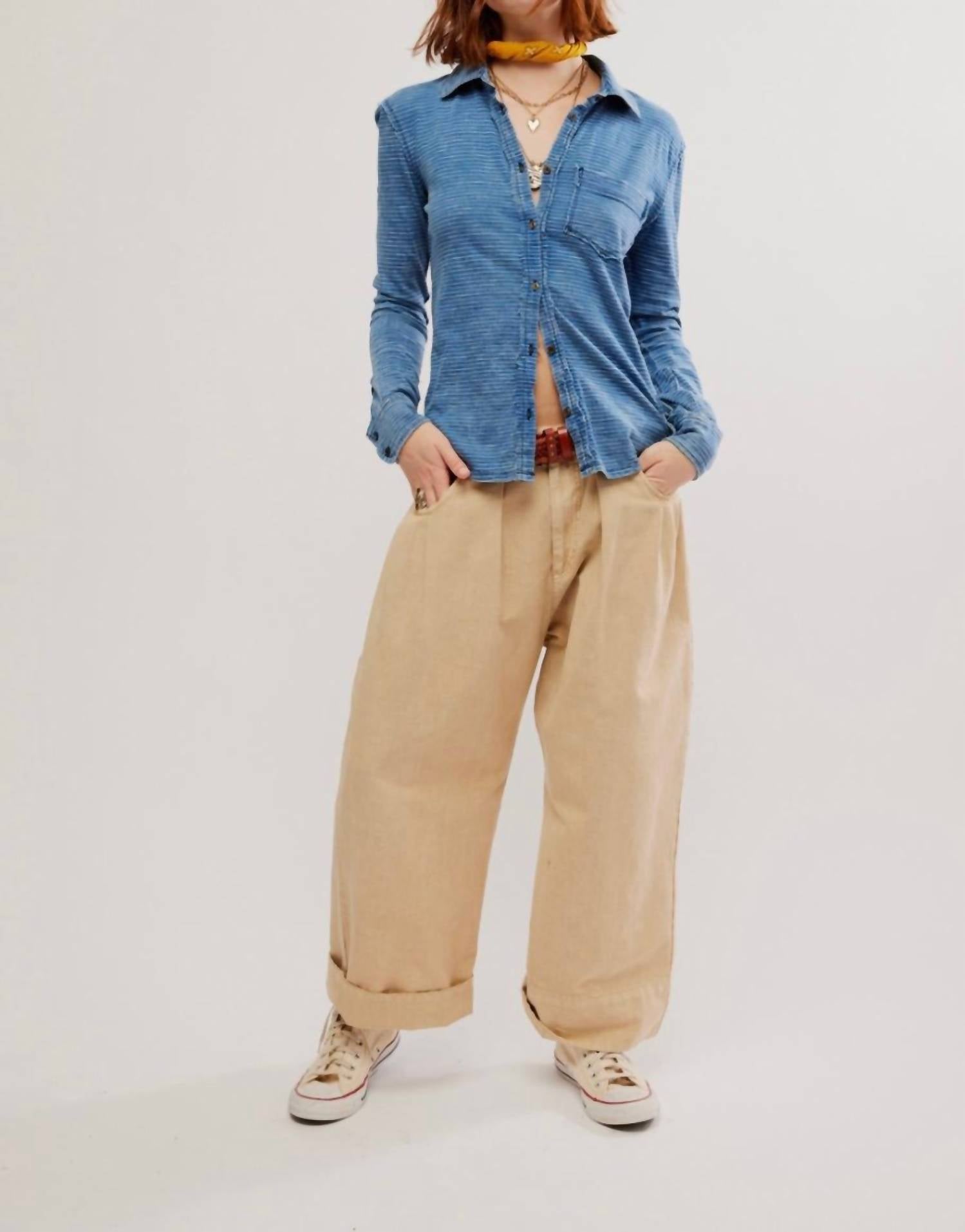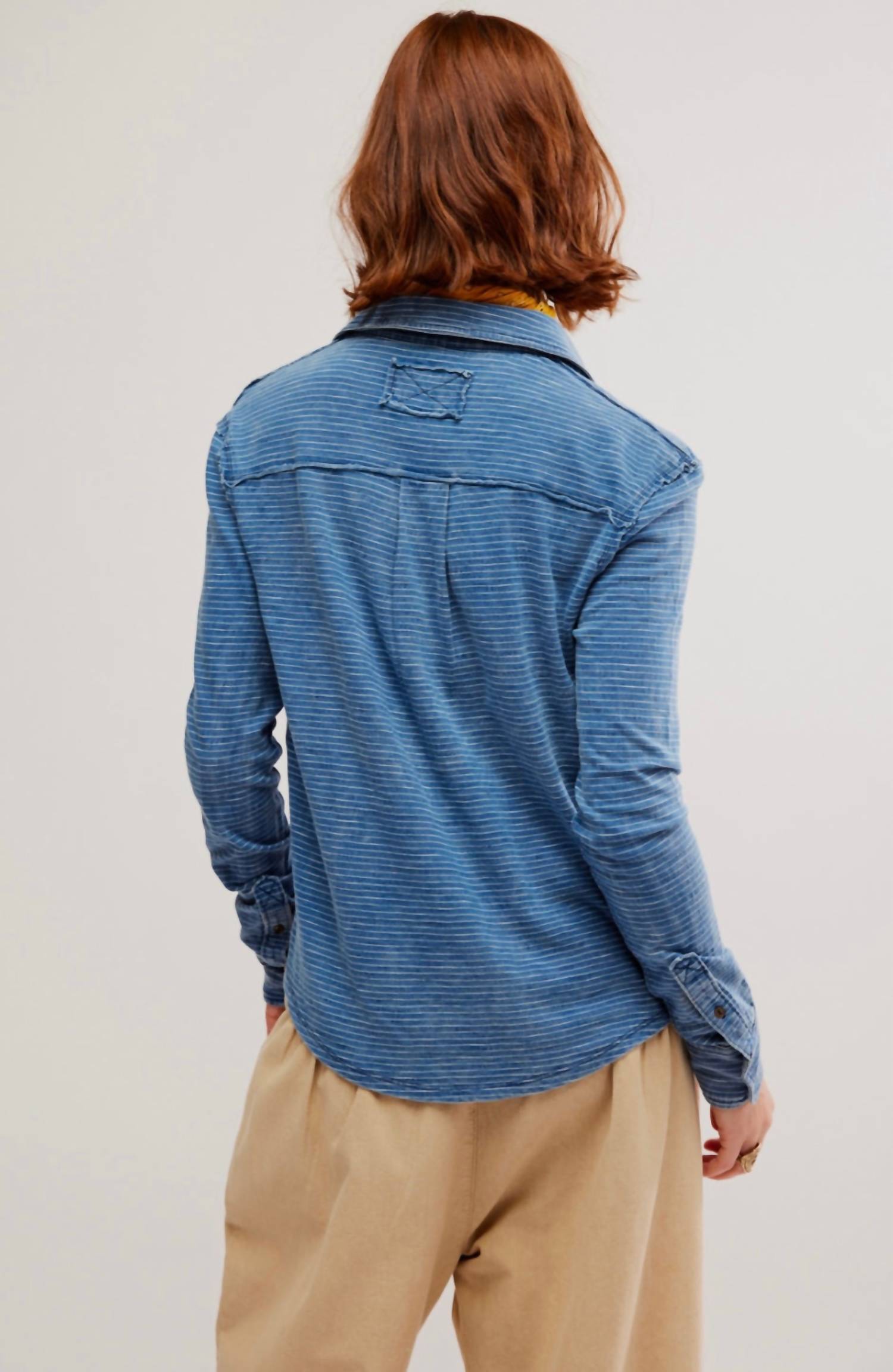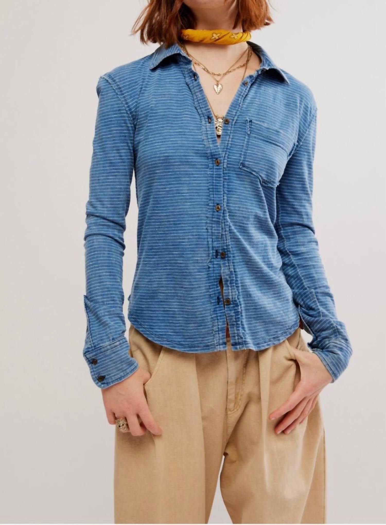 A classic button down shirt that will never go out of style. Meet the Long Sleeve Fitted Button Down Shirt by Free People, a stunning choice for any concert or Easter gathering. This vibrant blue piece showcases long sleeves and a classic collar with a chic stripe pattern. Designed with convenience in mind, it features a functional pocket and button closure. Care instructions include hand washing and laying flat to dry, making it a practical yet fashionable addition to your spring wardrobe.