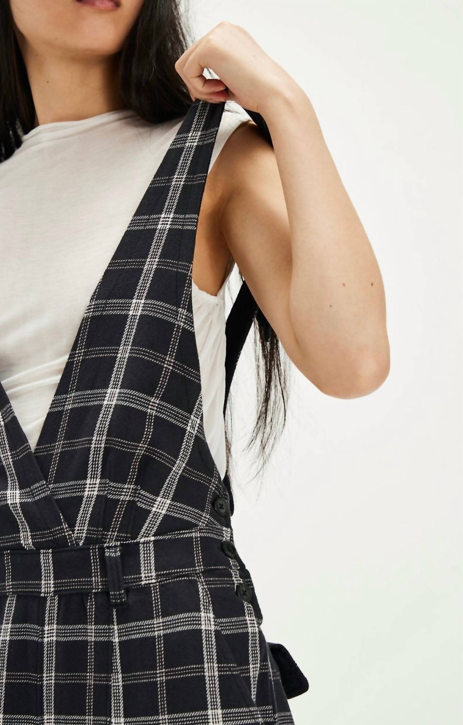 The perfect outfit choice when you you need something quick to throw on and still want to look efforlessly cool. Embrace a touch of menswear with the Mara Menswear Overalls by Free People, perfect for transitioning seasons. This stylish piece in a striking black plaid combo features a surplice wrap top and side button closures, complemented by a relaxed fit and wide-leg design. Made from 100% cotton with a rayon lining, it includes practical details like belt loops and a four-pocket design. Care for these overalls is easy with cold machine wash; an import crafted for versatile wear from sleek heels to casual sneakers.