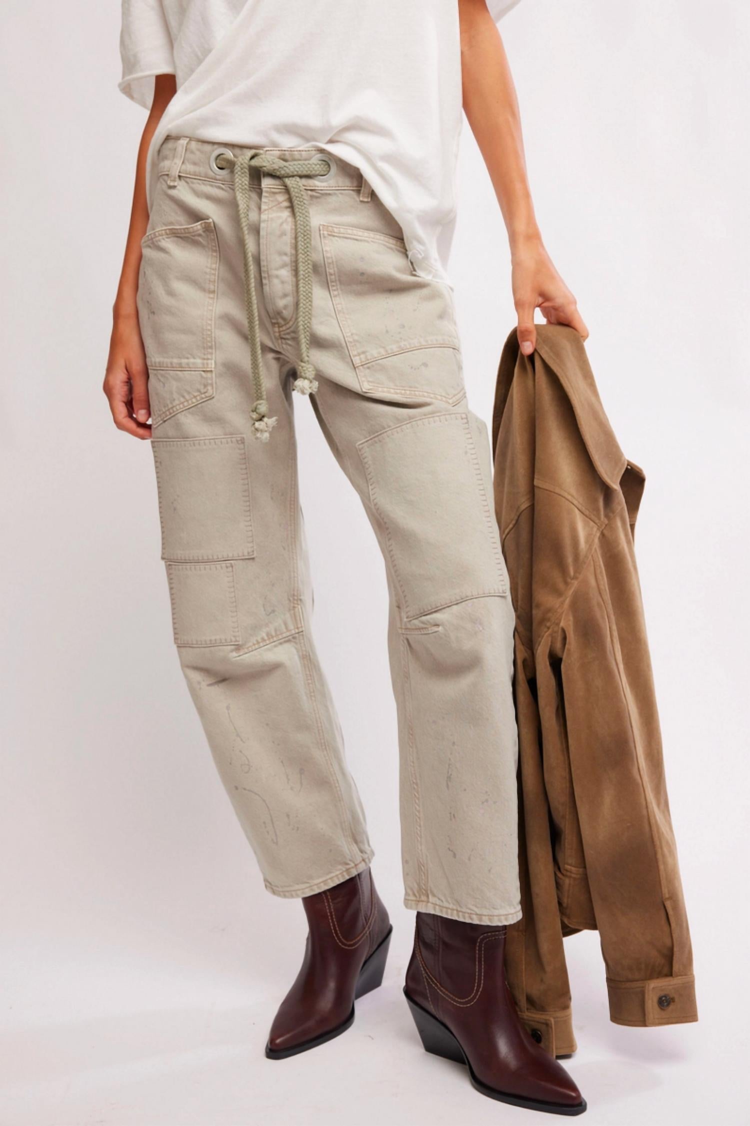 Pair these straight leg jeans with flats, sandals or even heels! You can't go wrong. Introducing the Moxie Jetty Pull-on Barrel Jeans by Free People, a standout piece in solid Jetty color from the We The Free collection. Designed for a relaxed fit, these jeans feature oversized patch pockets and a unique pull-on style with a contrast drawstring waist. Crafted from 100% cotton, the jeans boast distressed detailing and paint splatter features for a touch of edge. Dimensions include a waist of 33.5 inches, hips at 43.5 inches, and an inseam of 26 inches for size 28. Care: Machine wash cold. These jeans run large, so consider sizing down for a more fitted aesthetic.