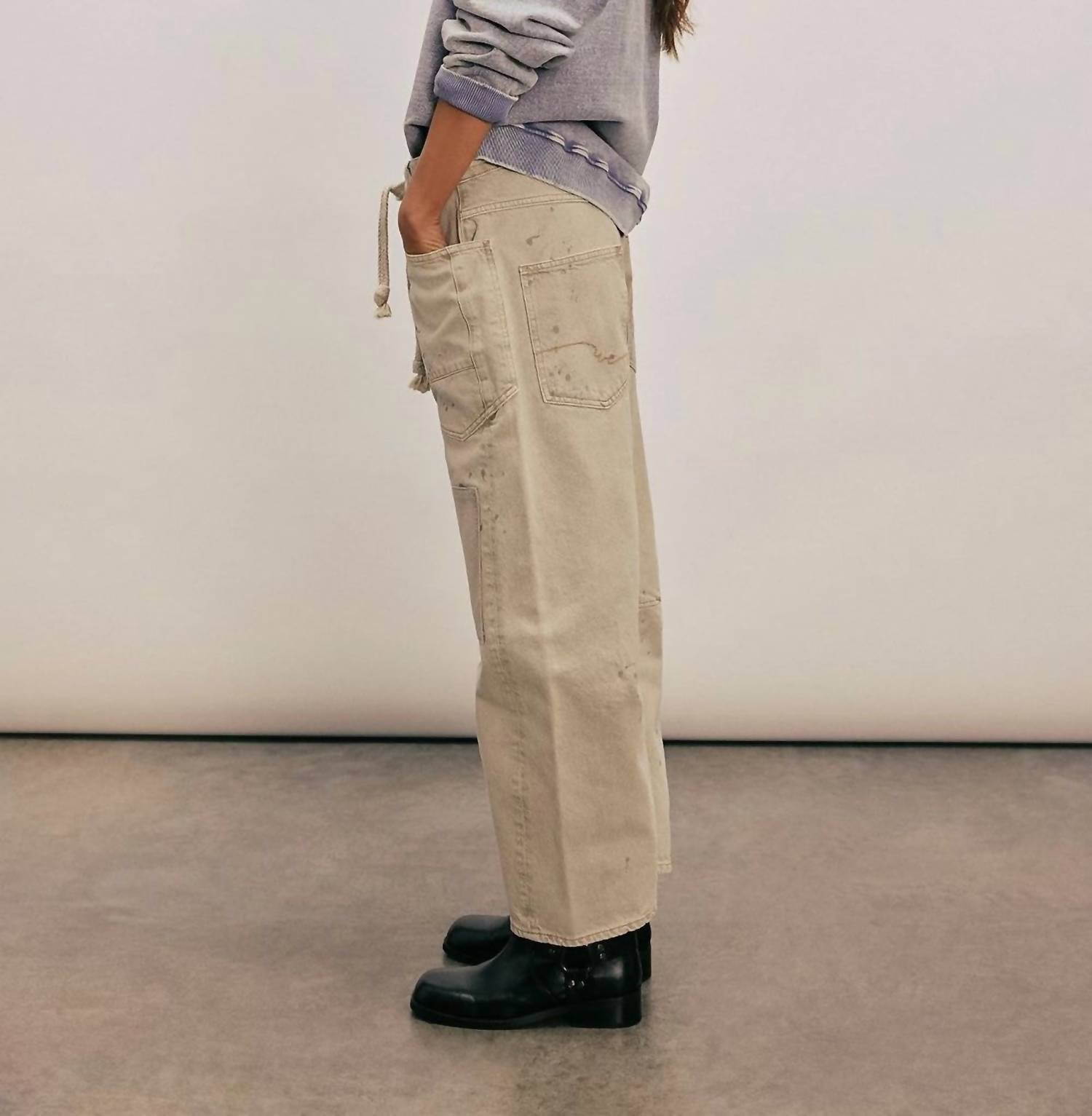 Discover the Moxie Low Slung Pull On Barrel jeans by Free People, an edgy addition to your denim collection. Designed with a relaxed fit and a straight leg style, these jeans feature a mid-rise, pull-on closure, and oversized patch pockets. Crafted from 100% cotton, the jeans showcase distressed detailing and playful paint splatters in a solid jetty color. Care instructions include machine washing in cold water. Perfect for making a statement during travel this fall.