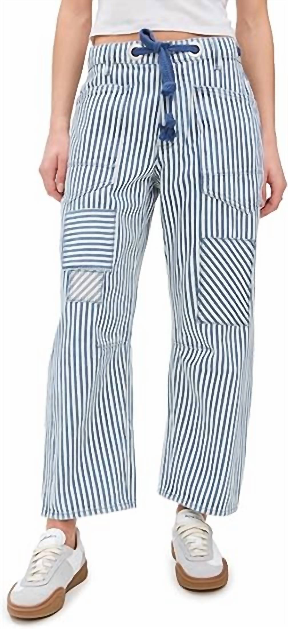 Presenting the Moxie Railroad Low-slung Jeans by Free People, an edgy addition to your denim collection in Dark Slate. With a relaxed fit and a high-rise design, these jeans boast a distinct railroad stripe pattern, distressed details, and oversized patch pockets. Crafted from 99% cotton and 1% elastane, these jeans offer a tapered silhouette with a 26-inch inseam and 11.75-inch rise. Closure: Pull-on style. Care: Machine wash cold and line dry.