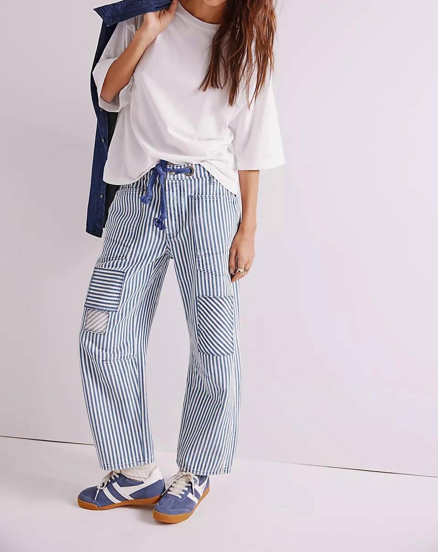 Just as cute as they are comfortable. Presenting the Moxie Railroad Low-slung Jeans by Free People, an edgy addition to your denim collection in Dark Slate. With a relaxed fit and a high-rise design, these jeans boast a distinct railroad stripe pattern, distressed details, and oversized patch pockets. Crafted from 99% cotton and 1% elastane, these jeans offer a tapered silhouette with a 26-inch inseam and 11.75-inch rise. Closure: Pull-on style. Care: Machine wash cold and line dry.
