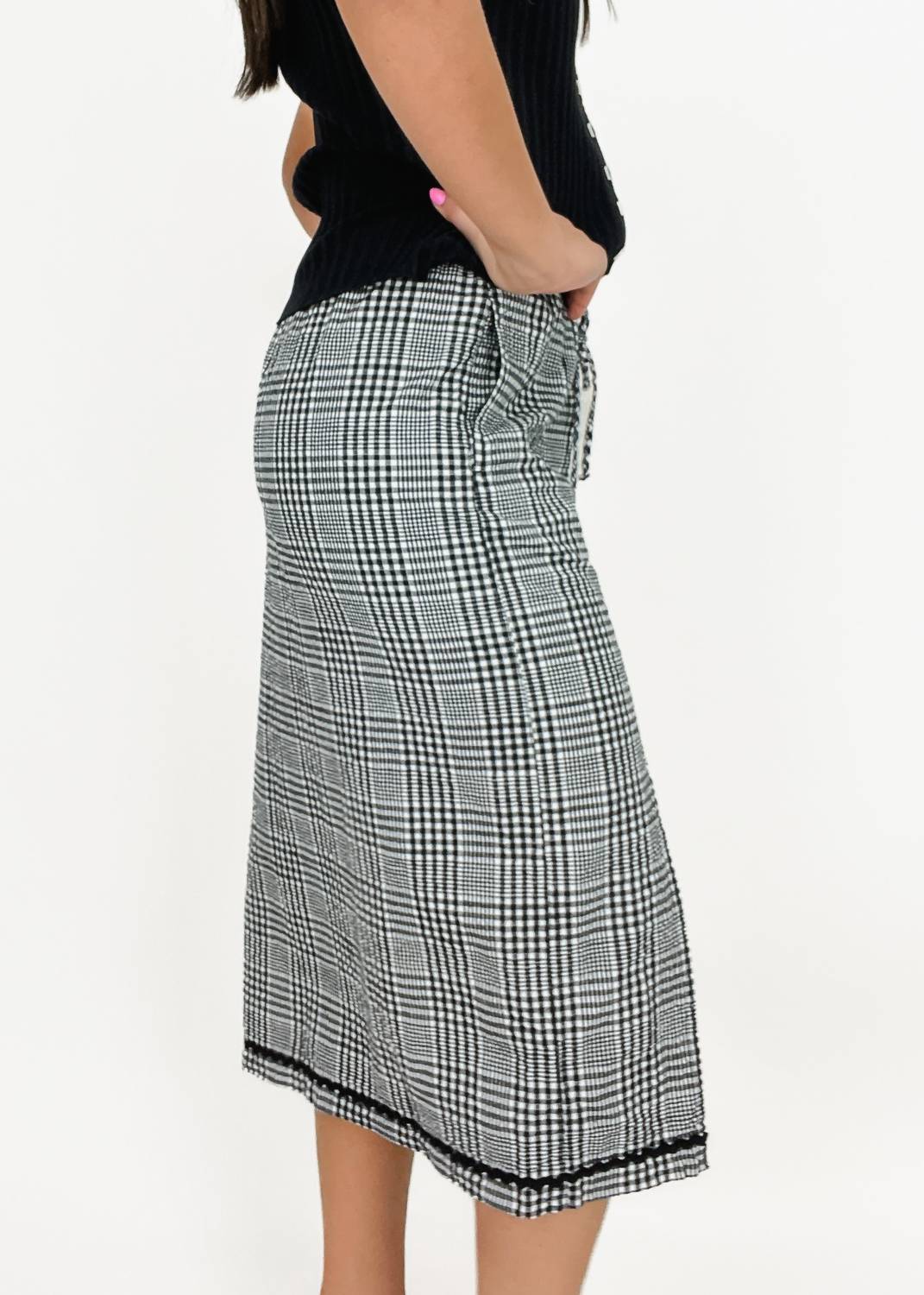 The midi length skirt is here to stay and we especially love this style. Experience effortless style with the Penelope Gingham Midi Skirt by Free People, a perfect blend of comfort and chic design. Featuring a relaxed column silhouette, this mid-rise skirt crafted from 100% cotton is perfect for any summer activity, adorned in a classic gingham pattern with soft seersucker material. Conveniently designed with practical side pockets and a vented hem, it ensures easy wear with a pull-on and drawstring waist. Care for this black combo summer staple with a simple hand wash in cold water to keep it looking its best.