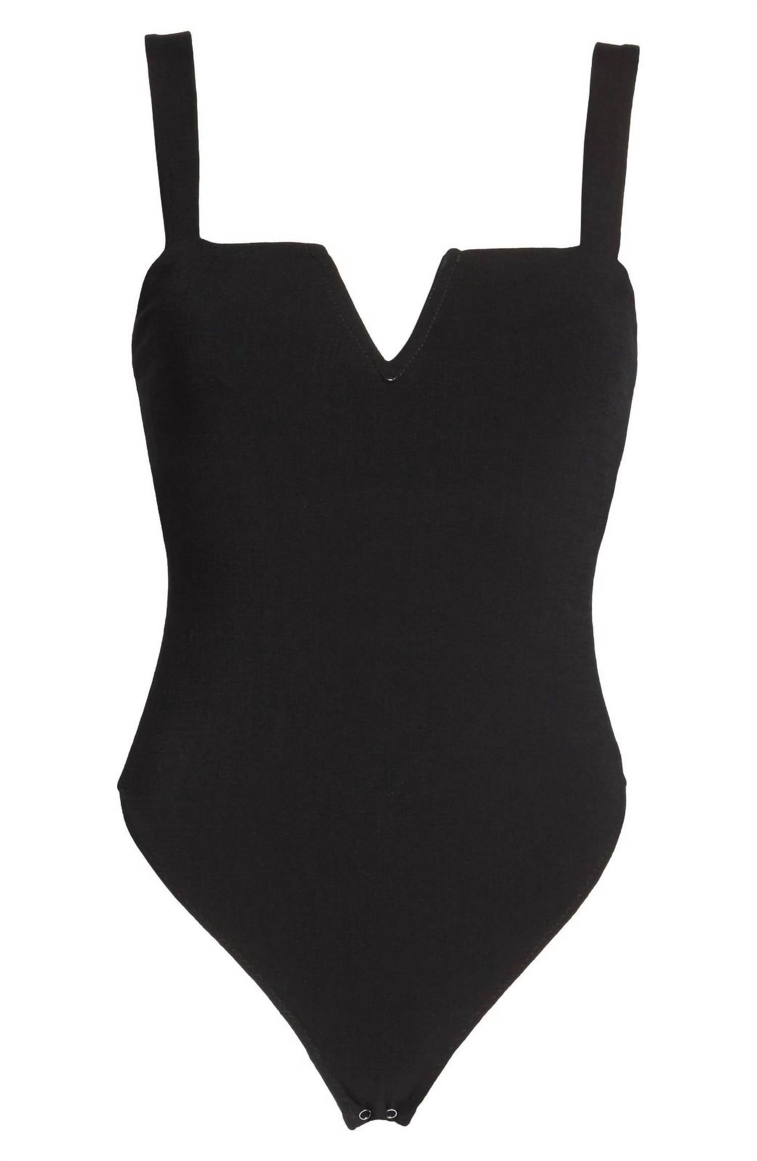 Pair this number with your favorite high-waisted jeans. Elevate your weekend style with the Pippa V-wire Thong Bodysuit by Free People in classic black. This sleeveless one-piece bodysuit features a split V-neckline with a V-wire center, open square back, and exaggerated armholes for a striking silhouette. Crafted from 97% Rayon and 3% Spandex, it offers a soft fabric with slight stretch, ensuring comfort and ease of movement. Pull on. Imported. Hand wash and line dry. Ideal for summer parties, its skimpy rear coverage adds a daring touch to your ensemble.