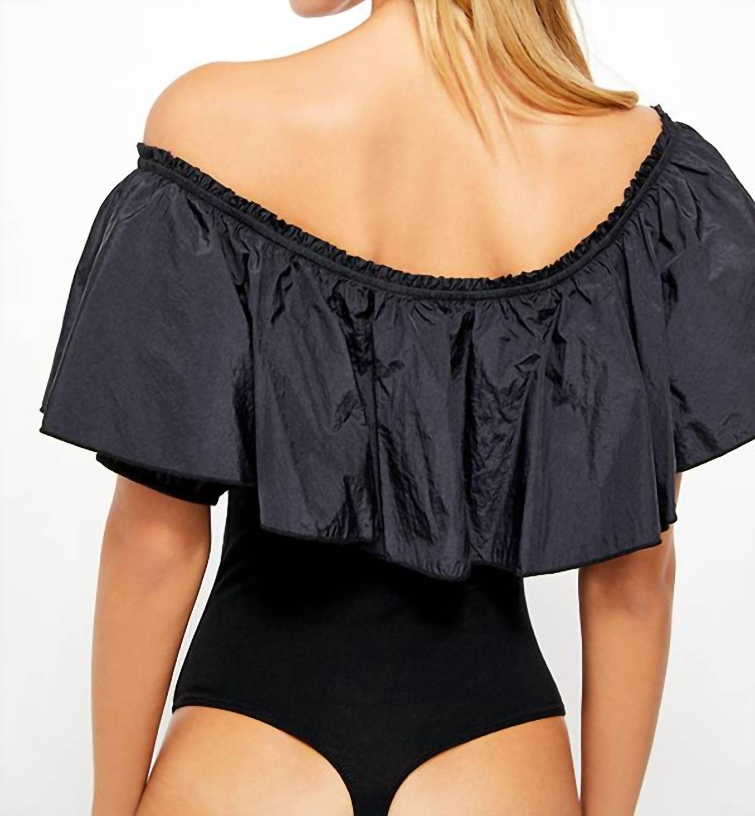 Pair this number with your favorite high-waisted jeans. Introducing the Poof Goes My Heart Ruffle Bodysuit by Free People. This short sleeve bodysuit features an off-the-shoulder neckline with a large ruffled detail and matching puffed sleeves. Crafted from a comfortable cotton blend with a formfitting knit bodice and thong bottom, it ensures a flattering silhouette. Snap closure. Hand wash. 95% Cotton, 5% Elastane.