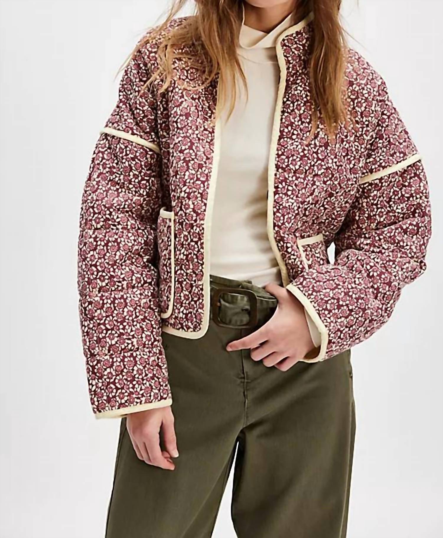 A casual yet cool jacket that every closset needs. Introducing the Raven Chloe Jacket by Free People, a chic addition to any wardrobe in a maroon combo floral print. This casual jacket boasts a slouchy, dolman-style silhouette with long sleeves and a high-collar design, enhanced by its quilt-inspired fabrication. Made with a blend of 91% cotton and 9% rayon, with filling composed of 100% polyester, it features a pull-on closure for easy wear. Imported and perfect for spring travel, care instructions recommend machine washing cold. Measurements for size small: 51" bust, 24" length, and 19" sleeve length.