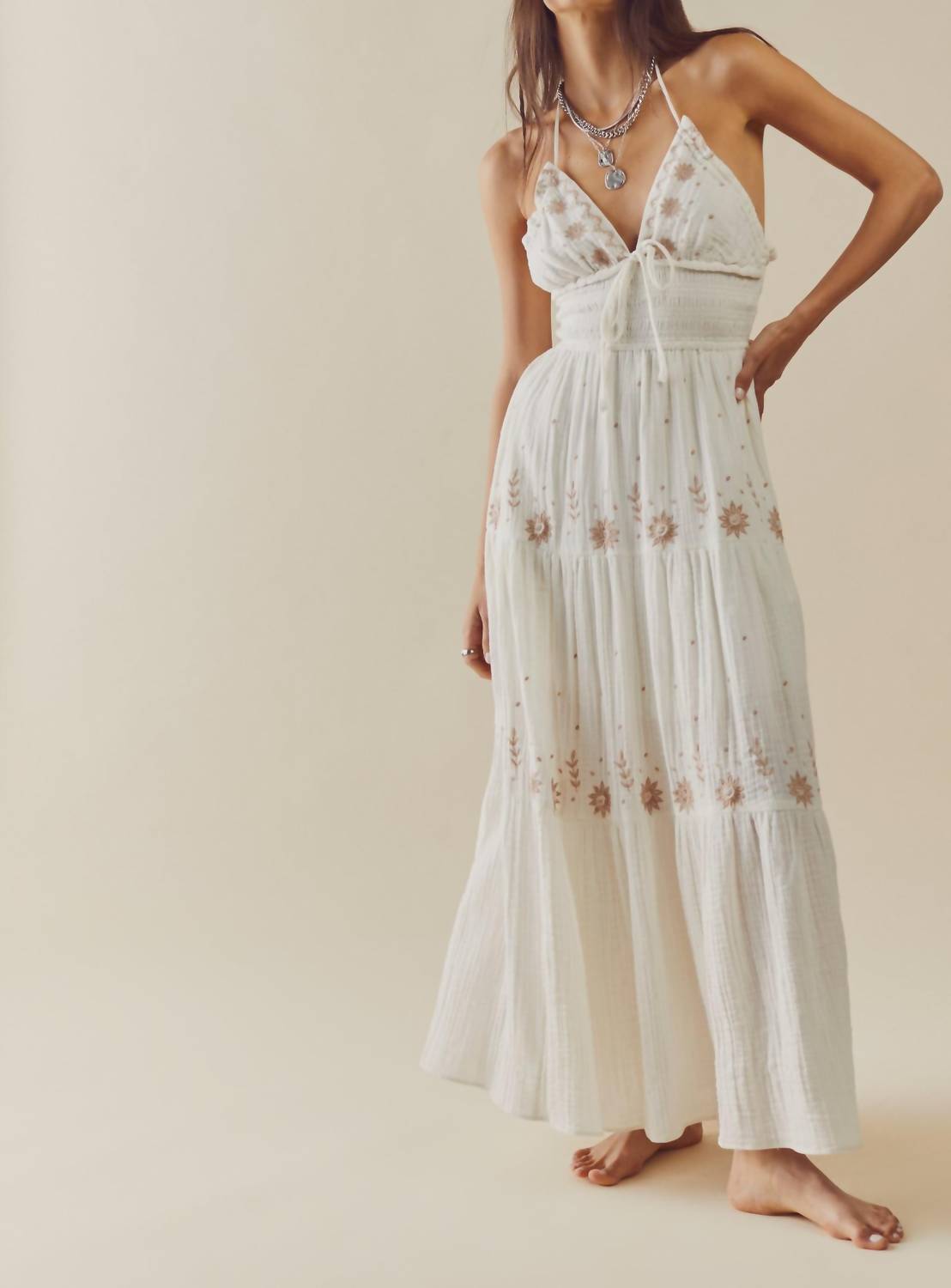 A maxi dress that is just as cute as it is comfortable. Step into elegance with the Real Love Embroidered Halter Maxi Dress by Free People, an exquisite choice for evening events. This sleeveless dress in Ivory Combo showcases intricate embroidery throughout and features a chic halter neckline. Composition: 100% Polyester. Garment Length: 51 inches. Closure: Effortless tie closure. Care: Machine wash cold gentle and lay flat to dry. Summon quiet luxury for special occasions with its empire waist silhouette, perfect for turning heads wherever you go.