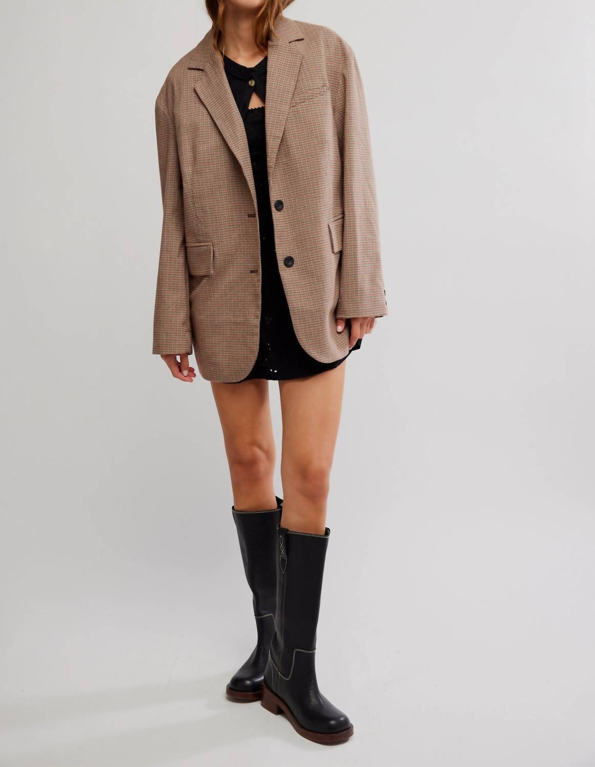 An elevated version of your favorite classic blazer. Introducing the Reggie Blazer in Ginger by Free People, a quintessential piece for the modern wardrobe. Crafted with long drop-shoulder sleeves, this oversized blazer boasts a composition of 64% Polyester, 34% Viscose, and 2% Elastane, offering both comfort and flexibility. The single-breasted button closure and tailored design make it perfect for layering over sweaters during cold-weather events. Featuring flap and slit chest pockets, this blazer is machine washable for easy care, making it a practical yet stylish choice for a Thanksgiving dinner party.