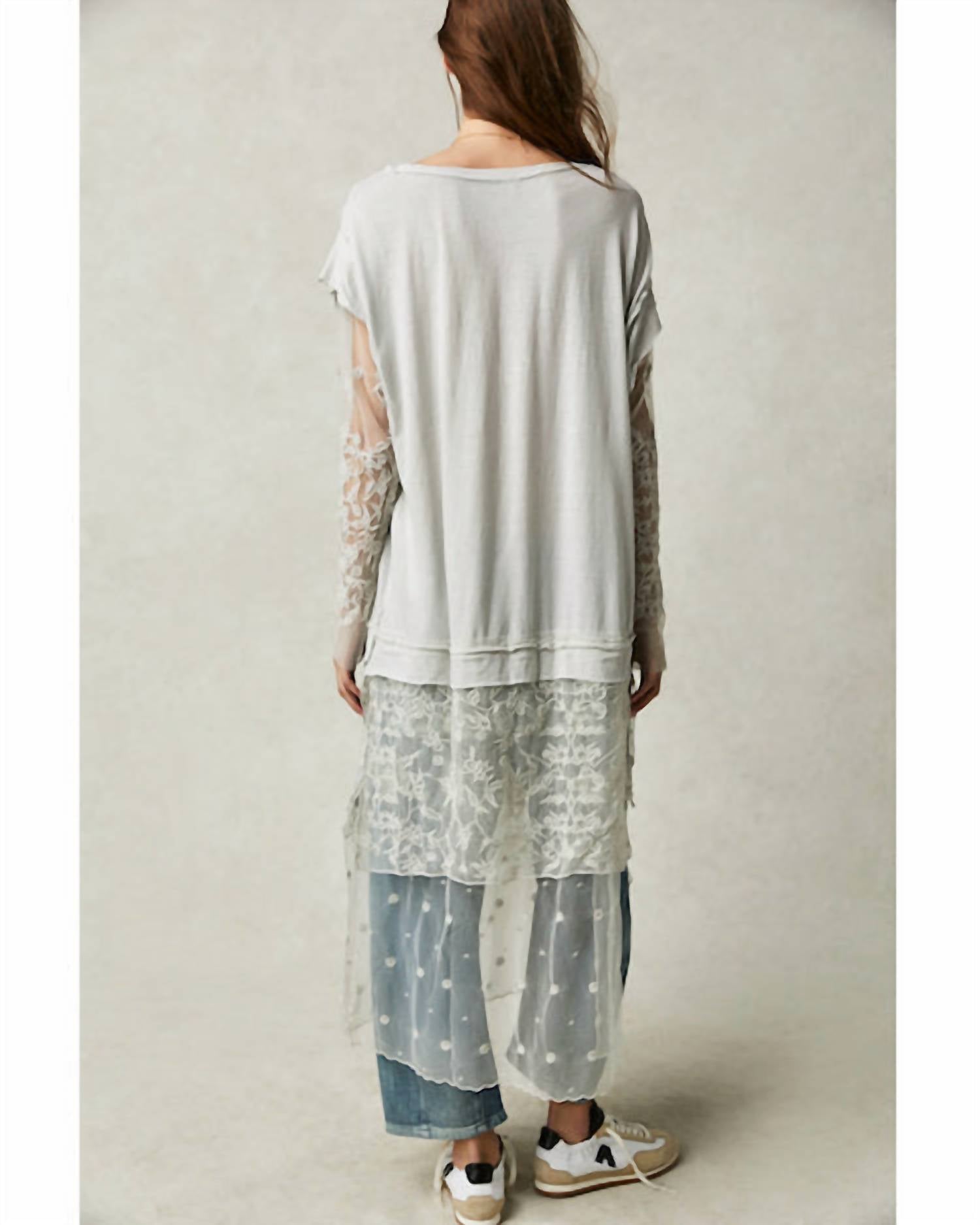 The perfect long sleeve tee that goes with just about anything. Introducing the Rock Steady Maxi Top by Free People, a statement piece in a beautiful Moonrock shade designed for edgy style. This tee features long sleeves with sheer, lace-adorned mesh detailing, crafted from a cotton blend for a maxi-length style. The top showcases a slouchy, relaxed fit with a scoop neckline, exposed seaming, and raw hems, enhancing its textured pattern. Closure is via pull-on style, and care is easy with hand wash instructions, making it perfect for music festivals and spring streetwear.