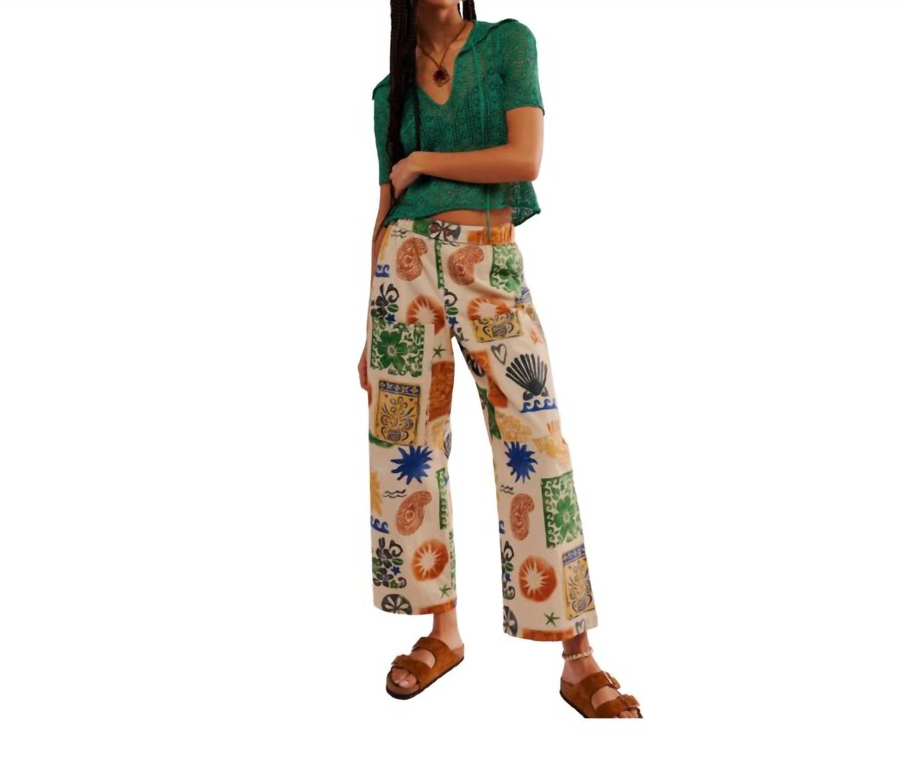 Enhance your wardrobe with this trendy cropped number, designed to blend style and practicality. The comfortable fit allows for easy all-day wear. The perfect length to pair with your favorite mules. Elevate your summer style with the Seaside Pull-On Pant by Free People, featuring a vibrant ivory combo-summer hue. Crafted from 100% cotton with a relaxed fit and wide-leg silhouette, these women's pants offer comfort and style with a 27" inseam and a 12.25" mid-rise. The pull-on design is complemented by a double-button closure at the waistband, making them ideal for vacations and leisurely outings. With a convenient pocket feature and graphics that evoke a beachy vibe, these imported pants are easy to care for with machine wash and line dry instructions.