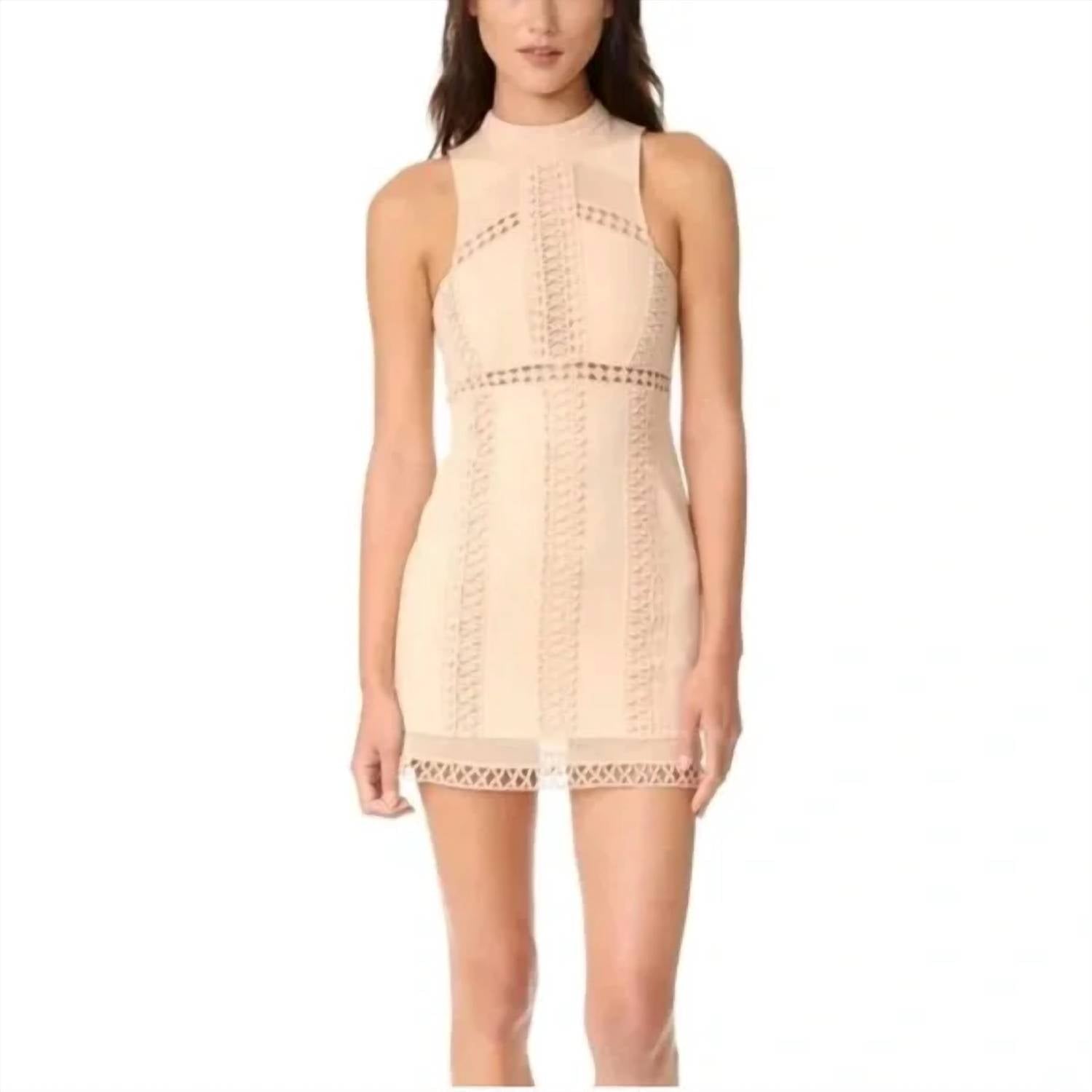 The perfect mini dress for those warmer months. Elevate your wardrobe with the Skyscraper Crochet Inset Dress by Free People, designed for women who embrace style and sophistication. This sleeveless bodycon mini dress features delicate lace crochet trim detailing, perfect for casual outings or evening events. Made from a ponte jersey material, it offers a flattering fit with its zip closure at the back. It's a nude-toned staple best suited for warm summer days and easily layered for fall and winter; remember to machine wash and line dry to maintain its intricate detailing.