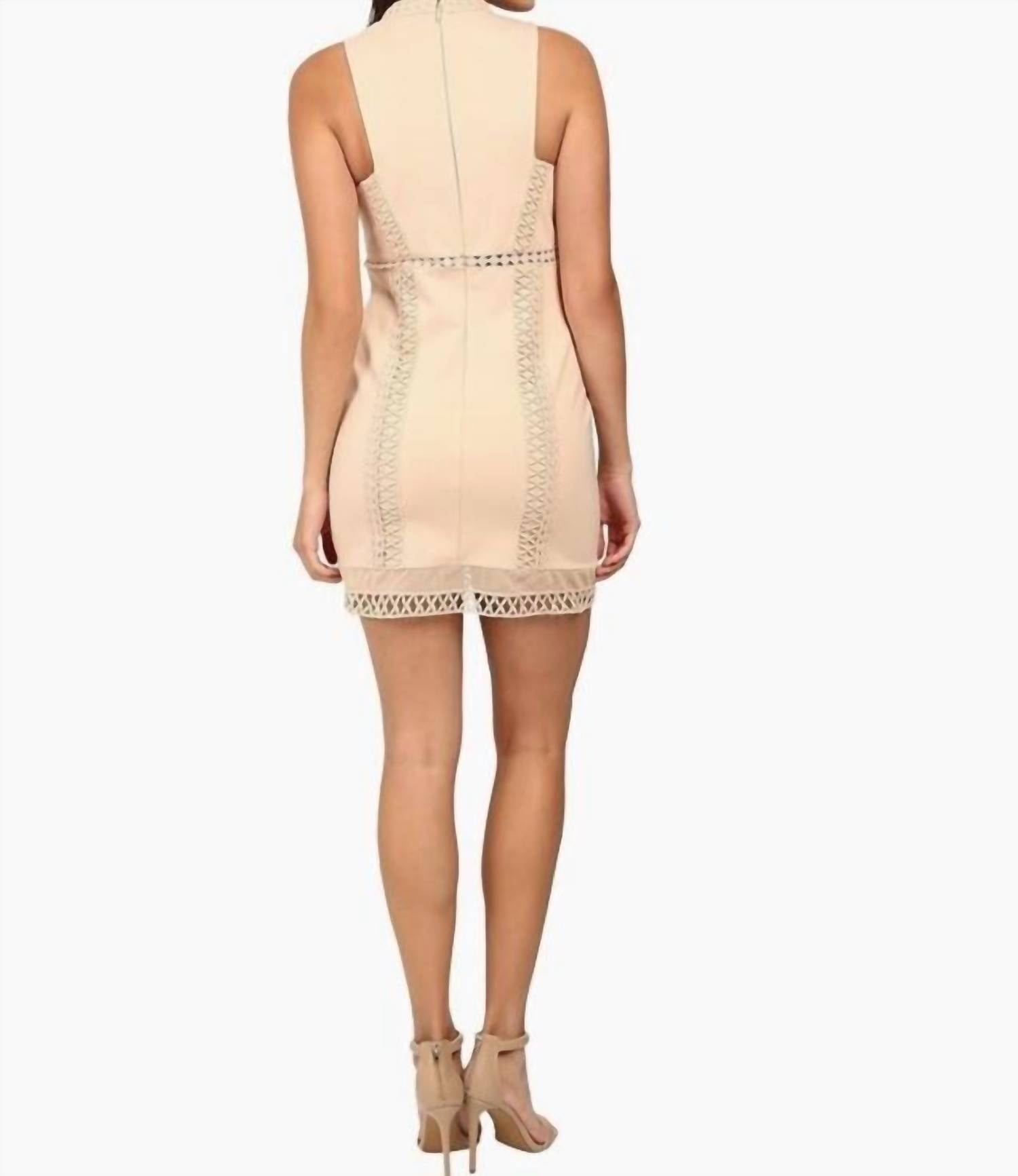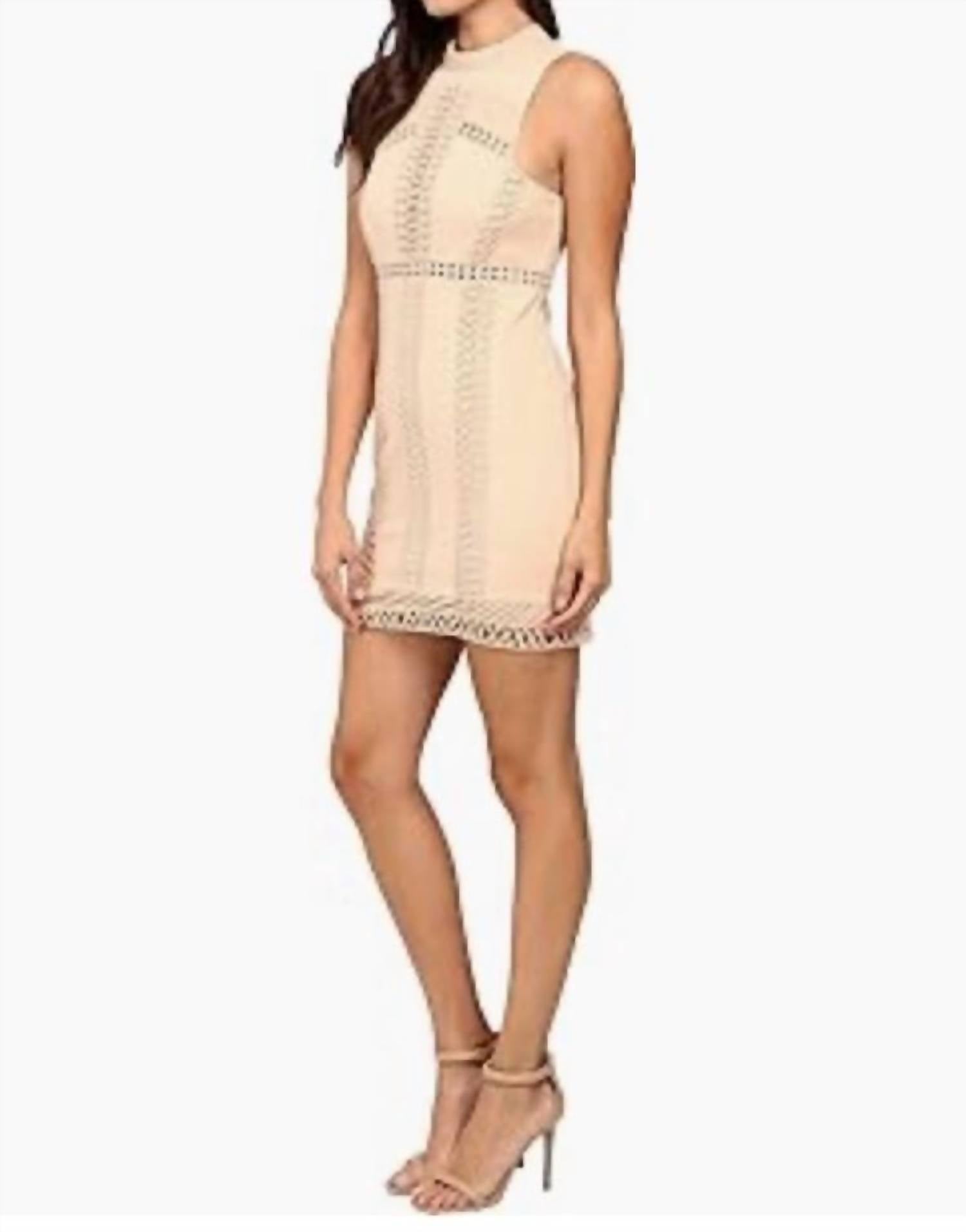 Unveil your chic side with the Skyscraper Dress by Free People, a stunning sleeveless bodycon mini dress perfect for warm summer days and nights. Made from textured ponte jersey with intricate lace crochet trim detailing, this dress hugs your figure beautifully. It features a convenient back zipper closure and its beige/nude color enhances its versatile, minimalist style. Please note, this dress is a size M but runs small, more fitting like a size S.
