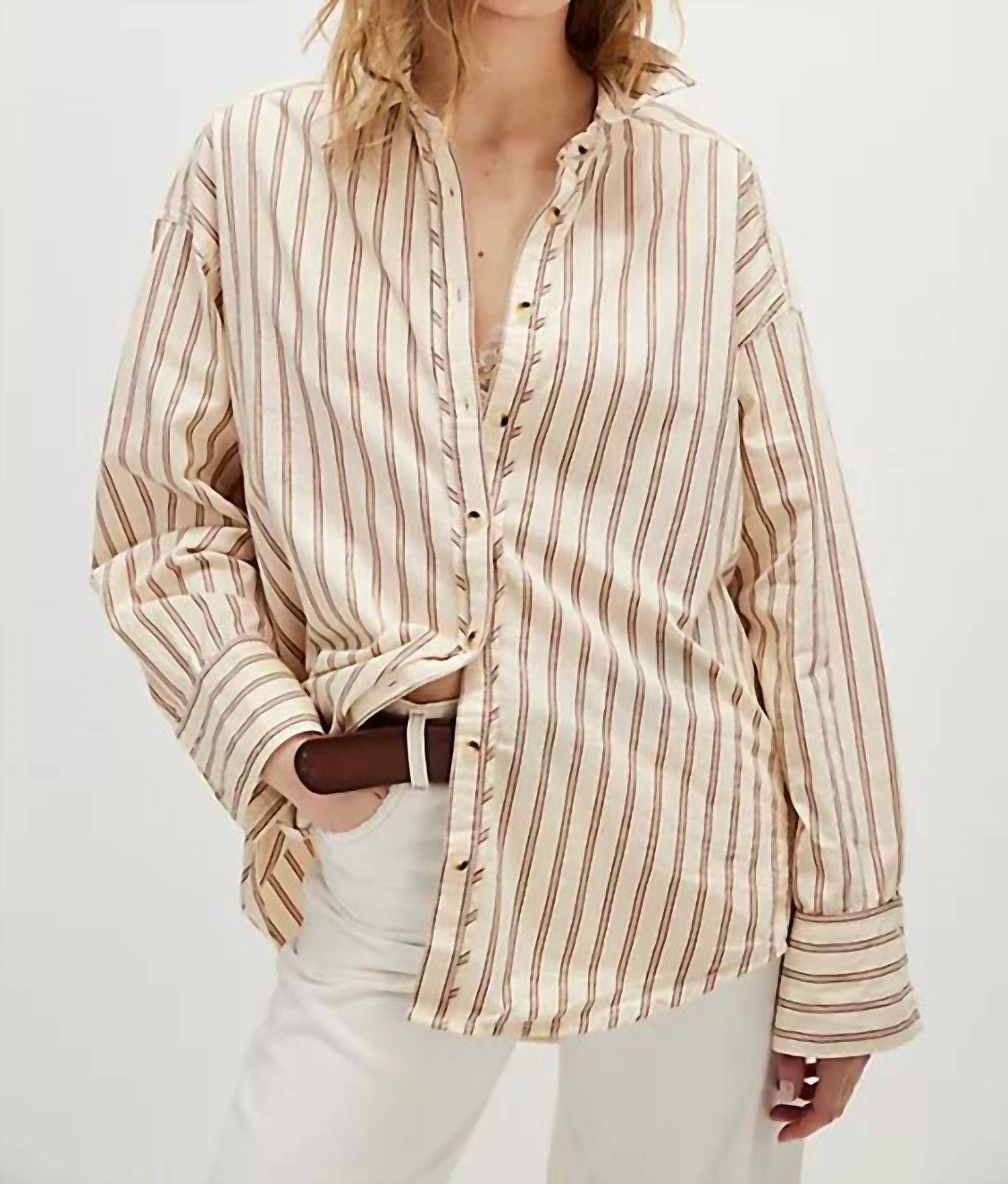 A timeless blouse that will never go out of style. Elevate your wardrobe with the Striped Varsity Vibes Shirt by Free People, crafted from soft cotton for a timeless appeal. This ivory combo blouse features long sleeves and a menswear-inspired striped pattern that exudes classic sophistication. Enjoy the oversized structured fit with a front button closure and a classic collared neckline for versatile styling options. Care: Machine wash.