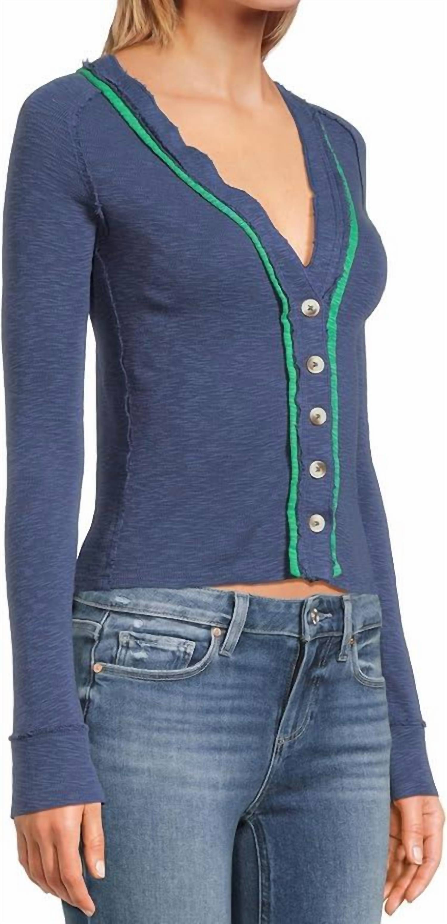 This cardigan will be a sweater-rotation favorite. The Free People Tipton Cardigan is a stylish indigo combo piece perfect for adding a preppy touch to your winter wardrobe. This cardigan features long sleeves and a shrunken silhouette, crafted from soft cotton for a comfortable fit. Measuring 21 inches in length, it sports a playful contrast trim and a deep V-neckline, secured with a button closure. Care is simple with machine wash instructions, making it a practical choice for the season.