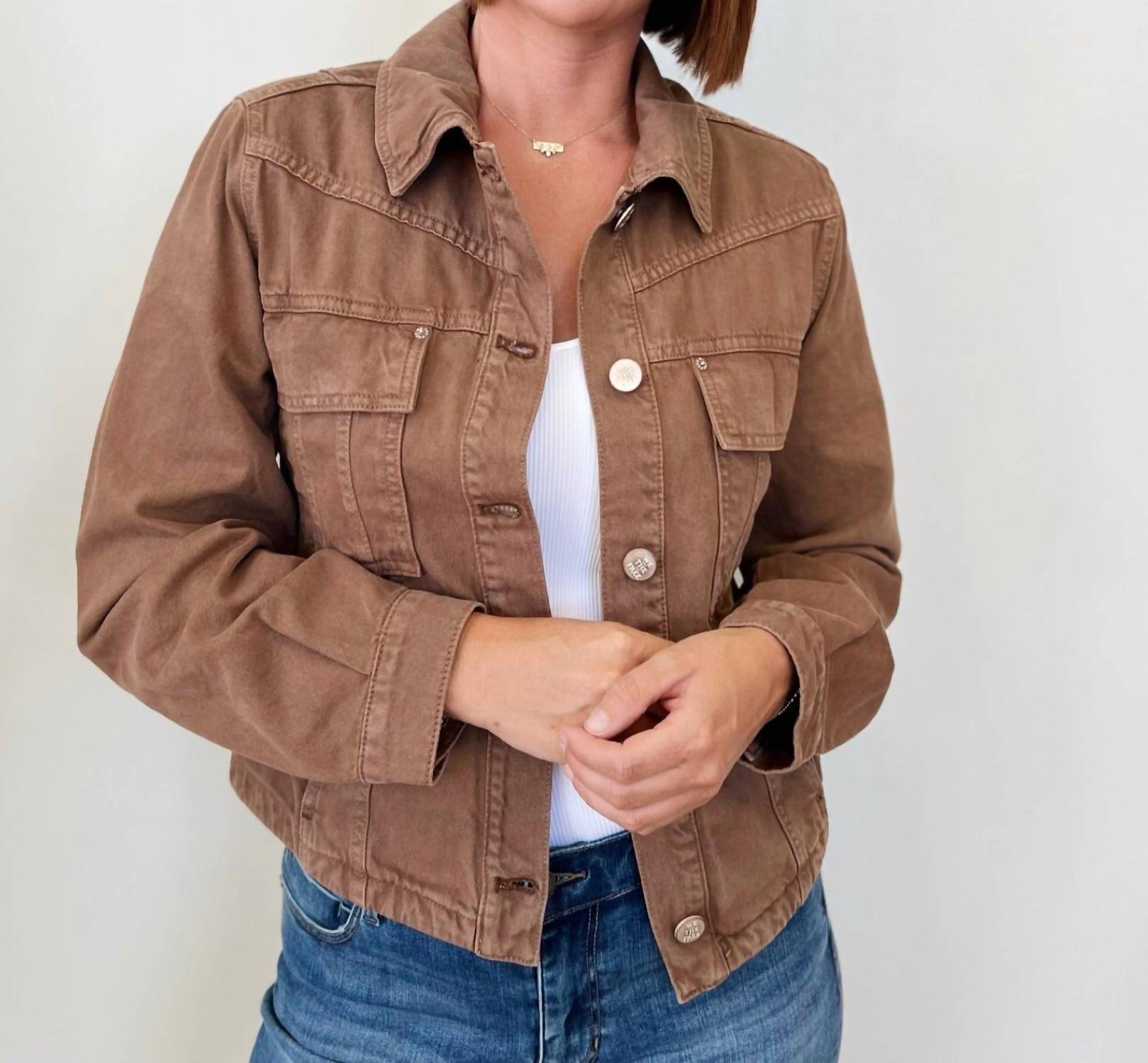 Throw this adorable jacket over just about anything for an effortlessly stylish look. Stylish streetwear piece in a rich chocolate hue perfect for fall travel. Features long sleeves, a collar neckline, and an off-kilter hem with stitched accents for a contemporary twist. With its relaxed, slightly cropped silhouette, offers the practicality of pockets and a secure button closure. Care is simple with machine wash and tumble dry instructions, making it an easy addition to your everyday wardrobe.