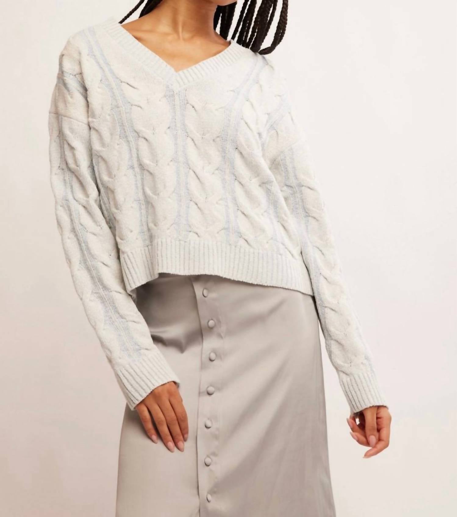 Wear this v-neck sweater with your favorite denim for the perfect fall look. Experience comfort and style with the Washed Cable V-neck Sweater by Free People, crafted in a textured, soft cotton blend. This sweater features long sleeves and a flattering V-neck design in a beautifully washed pale blue. 45% Cotton, 44% Polyester, 6% Rayon, 5% Acrylic. Pull on. Hand wash cold, use only non-chlorine bleach, lay flat to dry.