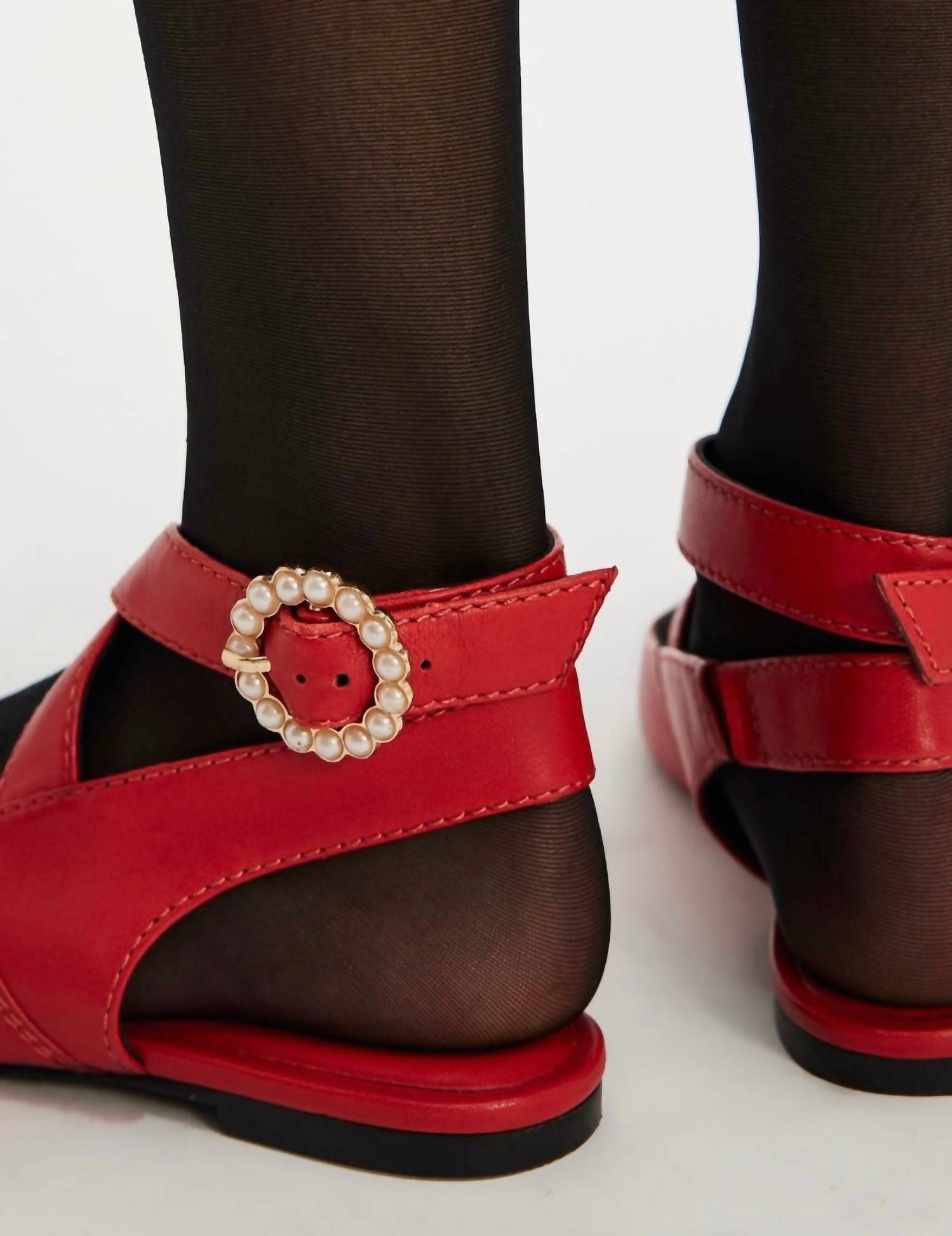 A classic loafer that is both comfortable and polished. Discover timeless elegance with Free People's Women's Parisa Point Flat in eye-catching red. These flats showcase sophisticated leather uppers with a sharp pointed toe, wrapped ankle strap, and a pearl-adorned adjustable buckle for a touch of grace. Made from premium leather and rubber, they feature slip-on styling with a flat heel under 1 inch for chic comfort.
