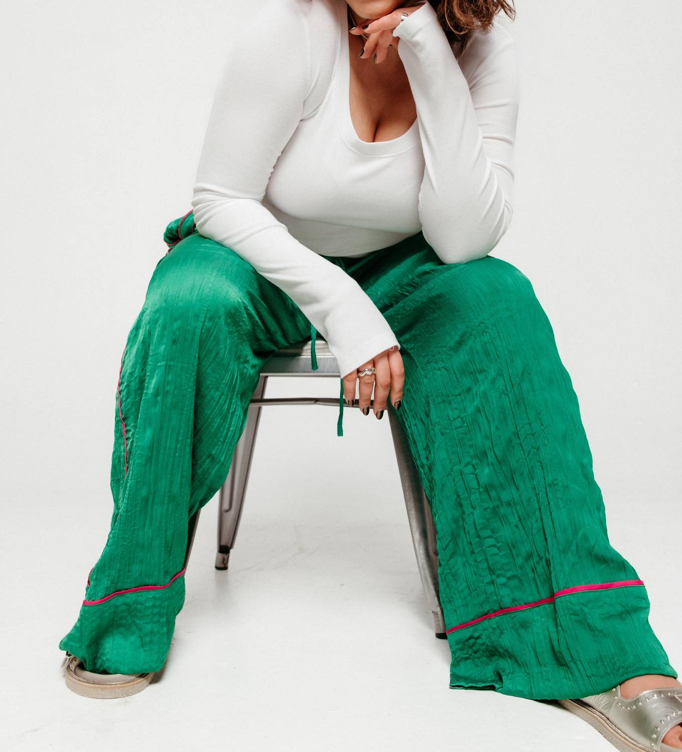 Introducing the All Out Satin Pant by Free People, a perfect addition for your pajama-inspired wardrobe in a stunning green hue. These low-slung pants feature a loose wide-leg silhouette with an elastic waistband for effortless pull-on ease. Crafted from luxurious satin plissé, they boast practical side pockets and elegant border pipe seaming throughout. This solid-patterned piece is ideal for summer travels.