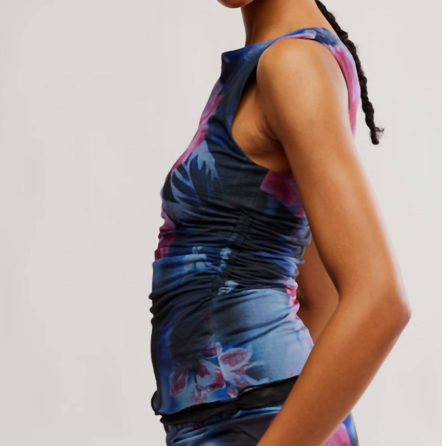 This classic tank top is perfect for layering and cute enough to wear on its own. Elevate your wardrobe with the Ash Printed Knit Top by Free People, a sleeveless marvel in striking Night Combo. Crafted from 100% polyester, it features a boat neckline, dropped armholes, and an asymmetrical hem with a layered lettuce-edge finish. Its slim fit and ruched side detail add a touch of flair to your ensemble, while the pull-on style ensures comfort. Care for this stylish piece with a machine wash on a cold gentle cycle.
