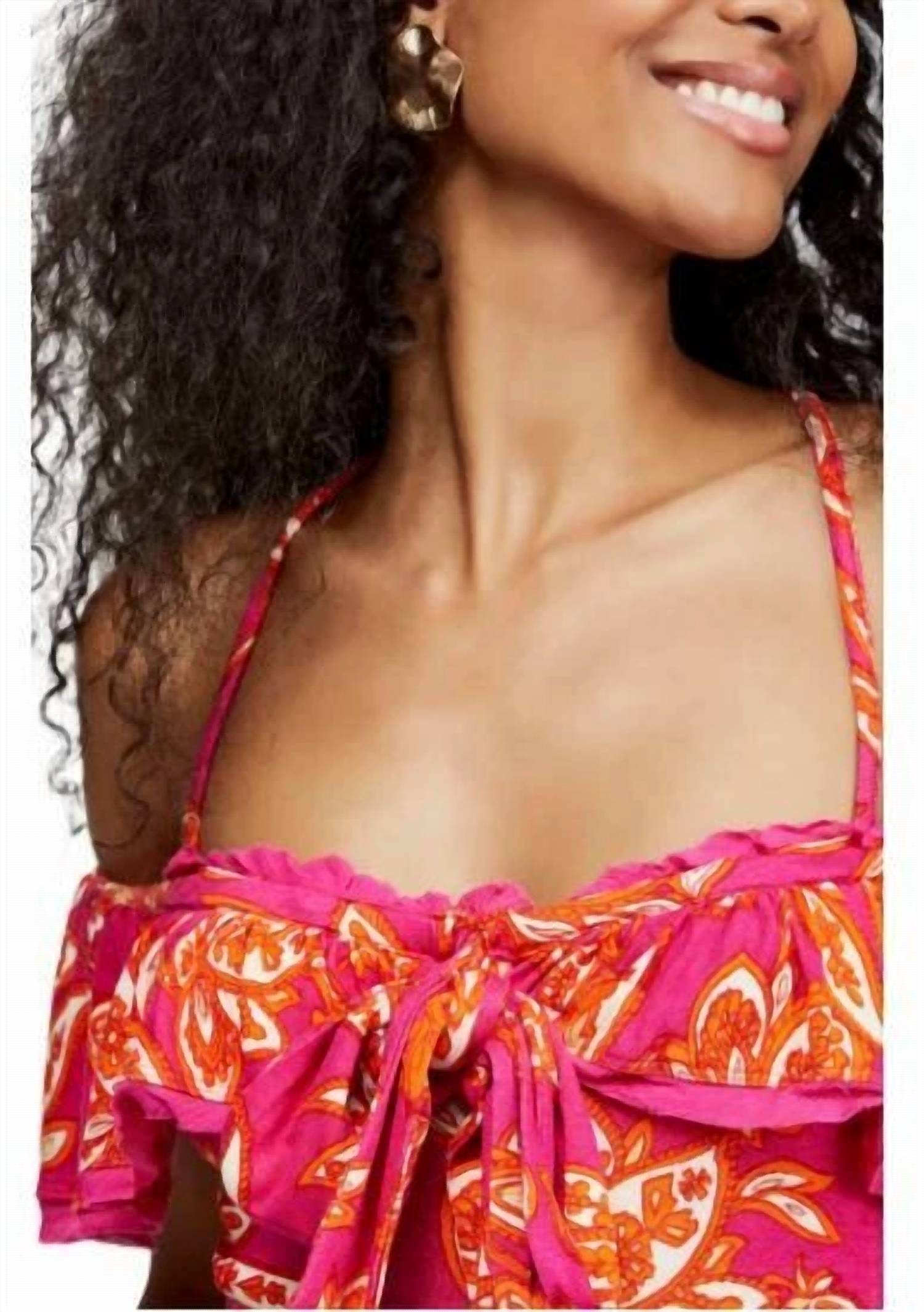 Introducing the Cha Cha Cold Shoulder Flounce Top by Free People, a vibrant addition to your wardrobe. This women's blouse boasts a detailed paisley print and features short cold-shoulder sleeves, designed with an off-the-shoulder flouncy popover neckline that ties into a charming bow. Made from a comfortable blend of 95% rayon and 5% spandex, this top measures 10" at the center front length. Easy to care for with machine wash and dry flat instructions, it's true to size for effortless styling.