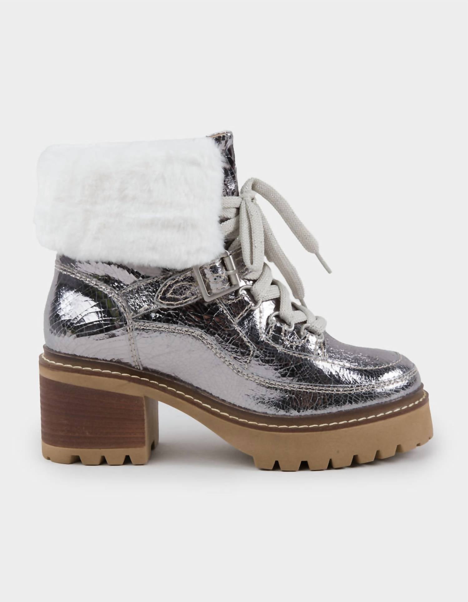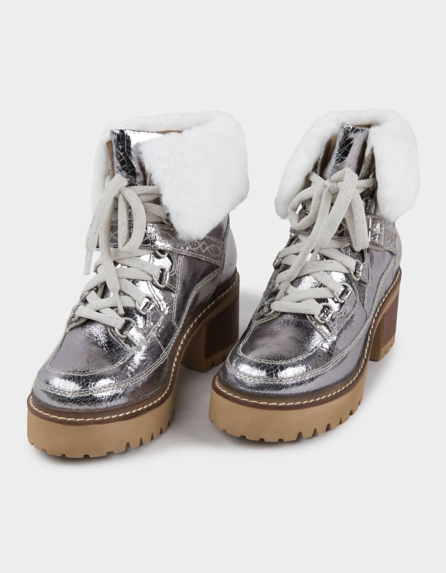 Introducing the Cozy Jasper Hiker Ankle Boot by Free People, a perfect blend of robust style and comfort. These boots, crafted from luxurious leather in a unique Pewter Cozy shade, offer a trendy ankle-length silhouette. The design features accentuating contrast stitching, a D-ring lace-up closure with two pairs of thick laces, and a durable platform sole with a stacked block heel. An ideal choice for fashion-forward women, these boots promise both durability and style for adventurous outings.