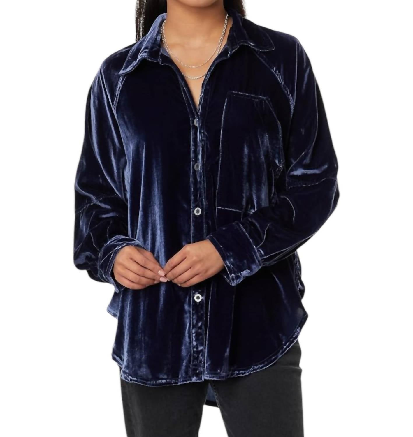 Chic navy textured button-front top. Features a relaxed drapey fit. Long sleeves and a classic collar neckline. Crafted from 75% Viscose and 25% Nylon. Includes charming details like a curved hem and frayed edges for a vintage touch. Length of 32 inches. Includes convenient pockets. Machine wash cold inside out.