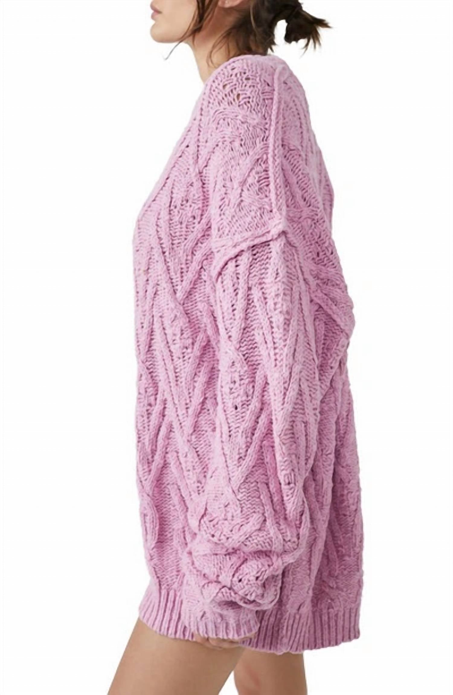 Comfortable and oversized piece in a delightful rose hue. Tunic-style sweater features long sleeves and a crew neckline. Crafted with a textured pattern of 86% cotton and 14% acrylic. Length of 28.5 inches adds to its cozy, versatile appeal. Pull-on closure. Hand wash and lay flat to dry for best results.
