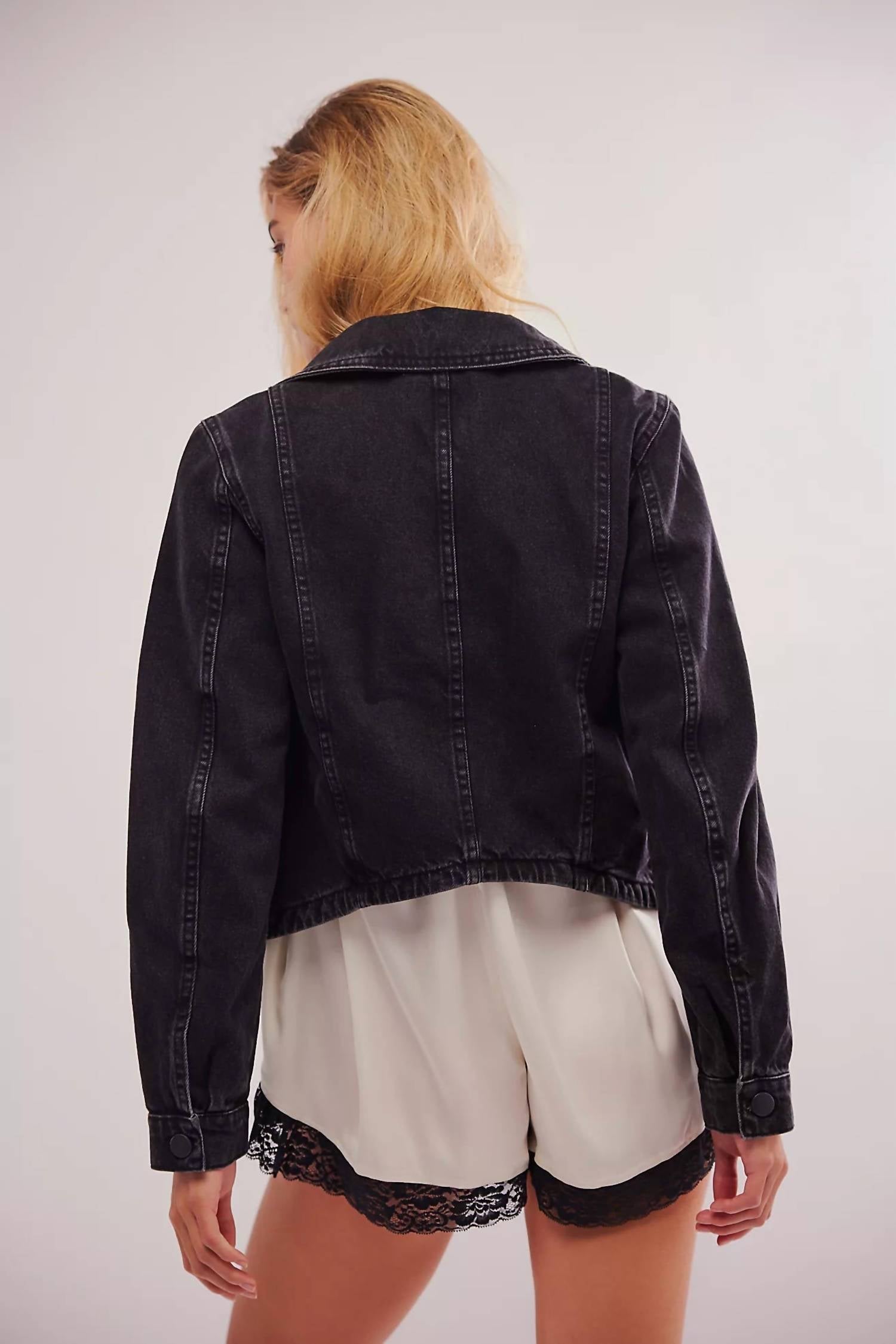 Throw this adorable jacket over just about anything for an effortlessly stylish look. Elevate your denim collection with the Jade Denim Jacket by Free People, featuring long button-cuffed sleeves and a distinctive asymmetrical hem. Crafted from classic 100% cotton denim in a washed black hue, this piece boasts a relaxed, semi-cropped fit with seamed details for modern flair. With its collared neckline, button-front closure, and convenient front flap chest pockets, this jacket is both stylish and functional. Care: Machine wash for easy maintenance.
