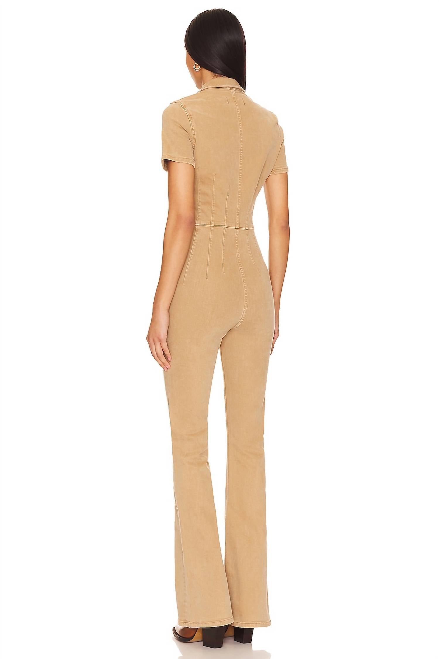 Perfectly crafted in a rich brown hue. Iconic flare silhouette with modern-day charm for a curve-hugging finish. Designed with a slim fit through the bodice and thigh. Flares out into a playful leg. Exaggerated yoking and darting detail. Zip-up closure and collared neckline. Made from comfy stretch denim. Flattering fit and sultry edge. Machine washable for easy care. Measures 33 inches at the inseam, with a rise of 12 inches, making it a perfect blend of comfort and style.