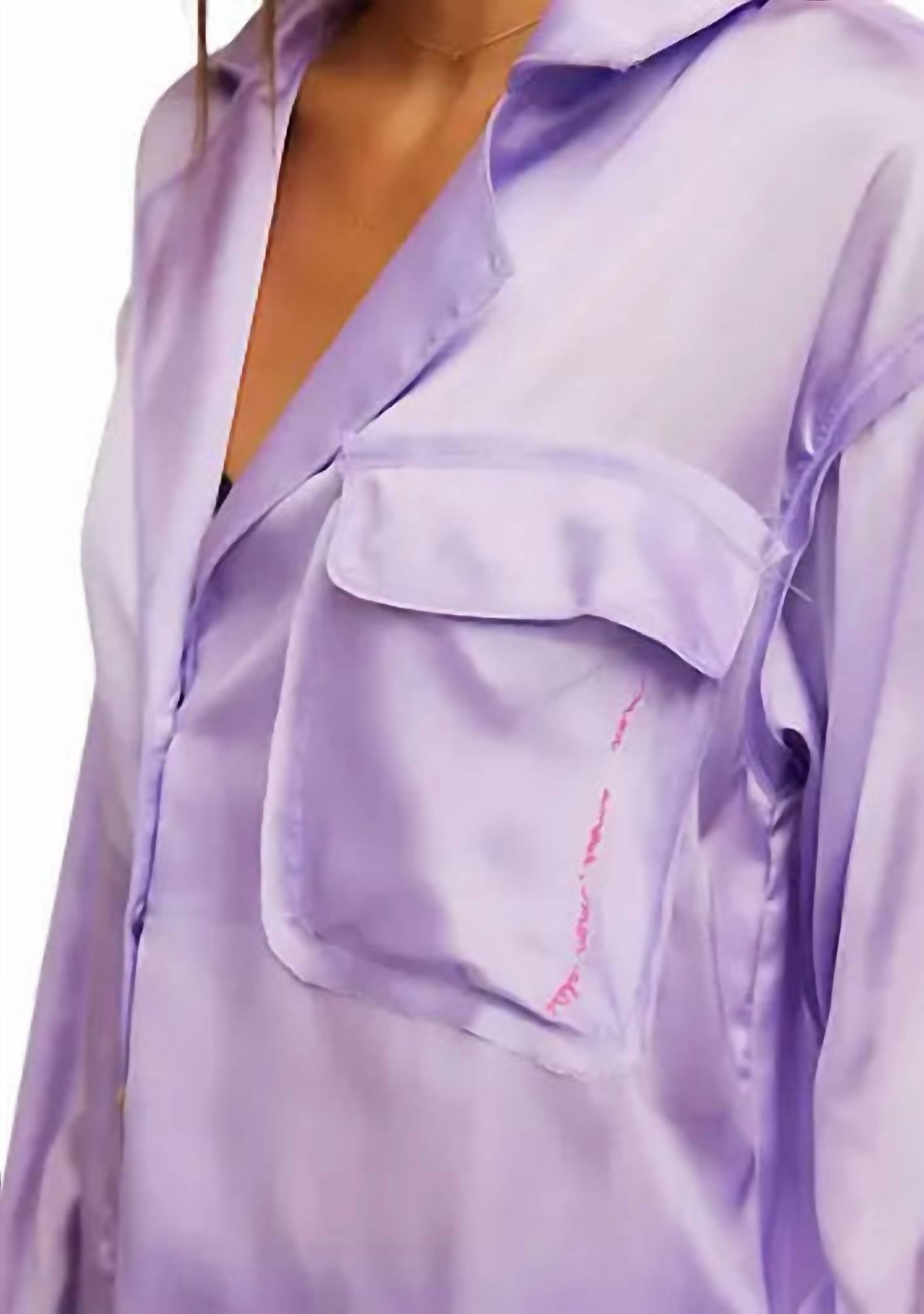 Pair with cozy slippers for pajama perfection. Introducing the Like Honey Pajama Shirt by Free People in a serene Orchid Bloom hue, perfect for a relaxing evening or vacation getaway. Designed with long sleeves and crafted from 100% soft polyester, this slightly oversized PJ top offers a billowy fit. It features a notched collared neckline and a button-down front, adorned with a chic chest pocket and exposed seams for added character. Origin: Imported. Care: Machine wash cold for easy maintenance.