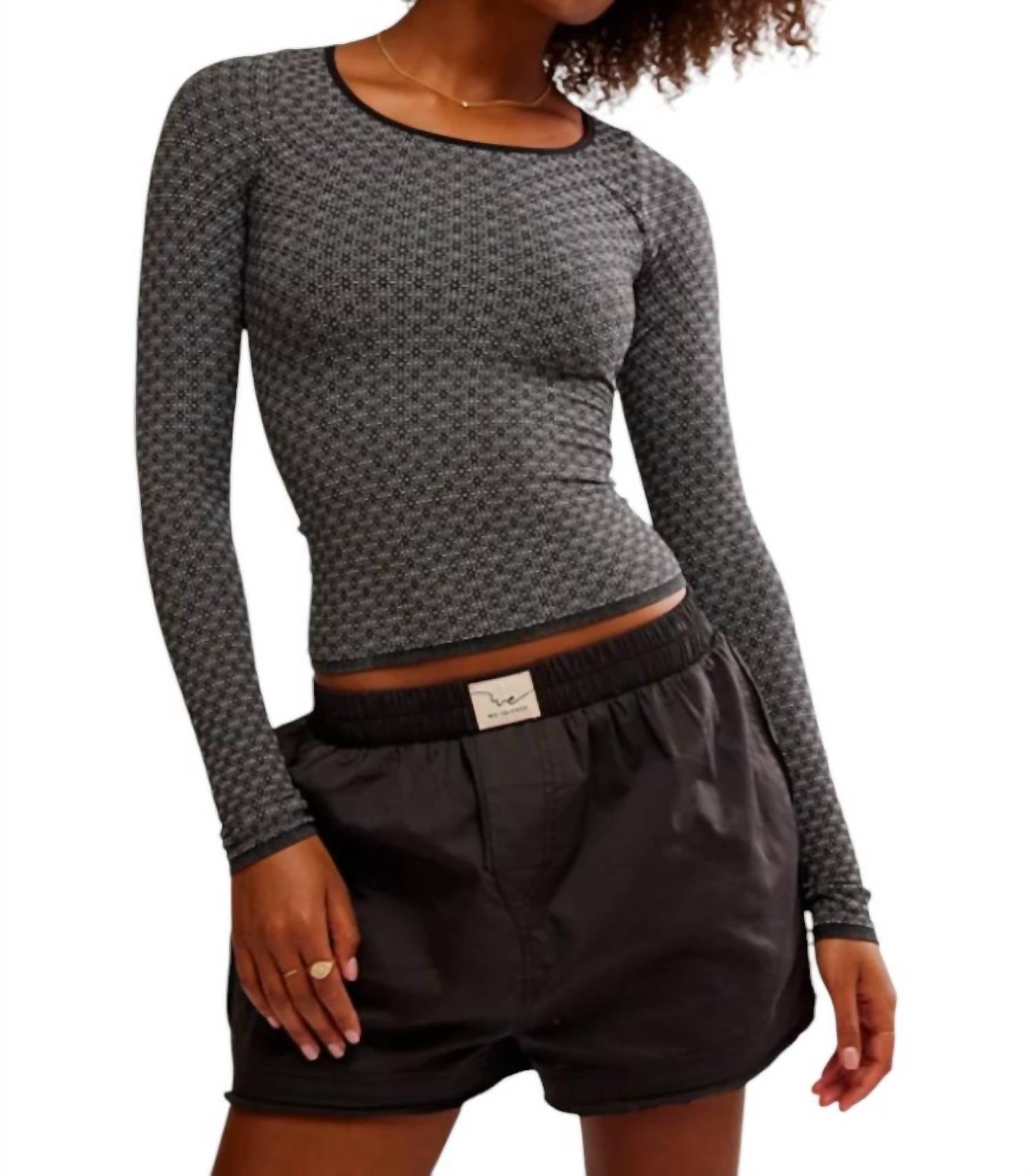 Ultimate versatile piece. Long sleeves and crafted from a blend of 64% nylon, 28% polyester and 8% spandex. Offers a formfitting and slightly cropped silhouette. Designed with a seamless scoop neckline. Soft textured fabrication ensures comfort and style. Made in US. Effortlessly cared for with a machine wash cold.